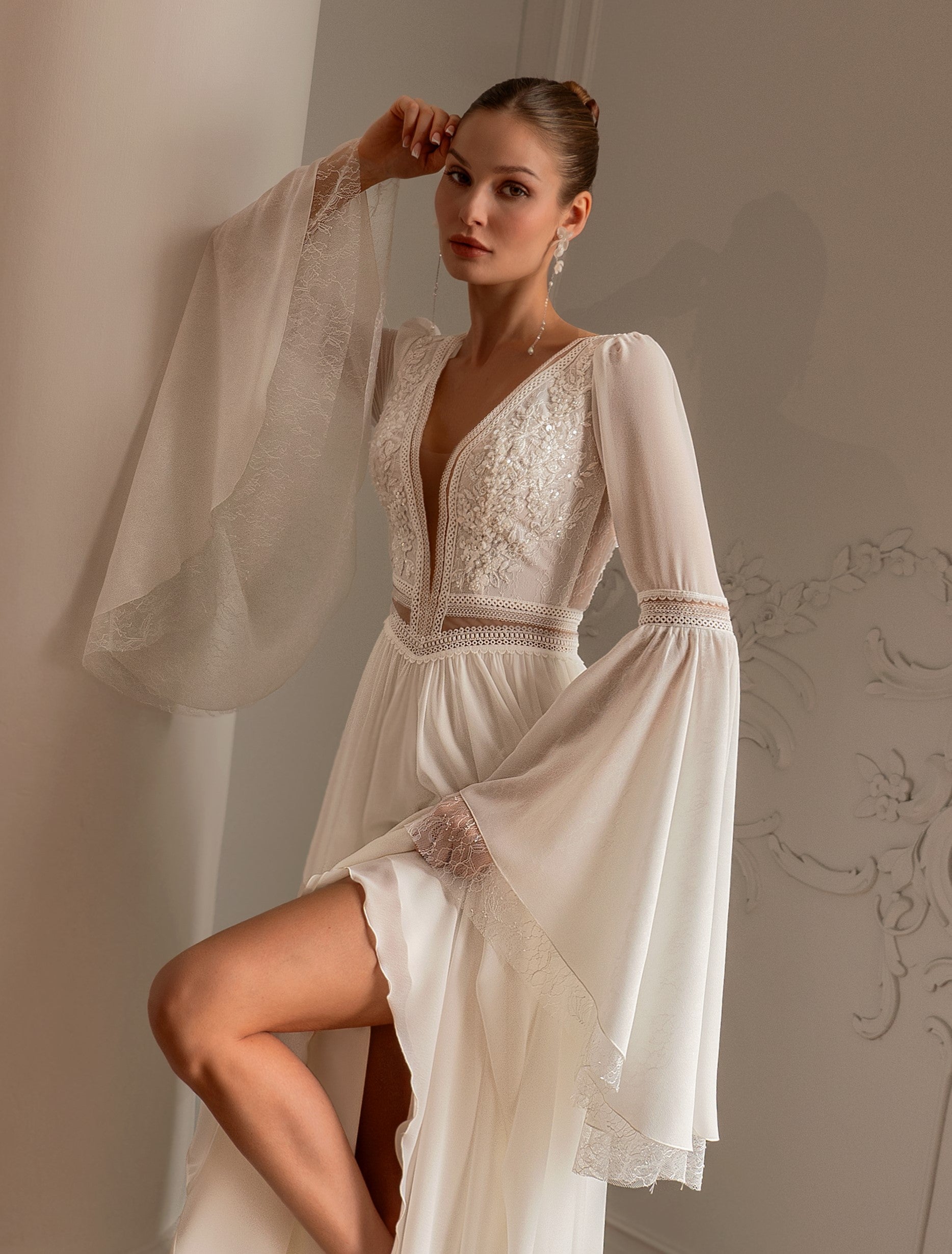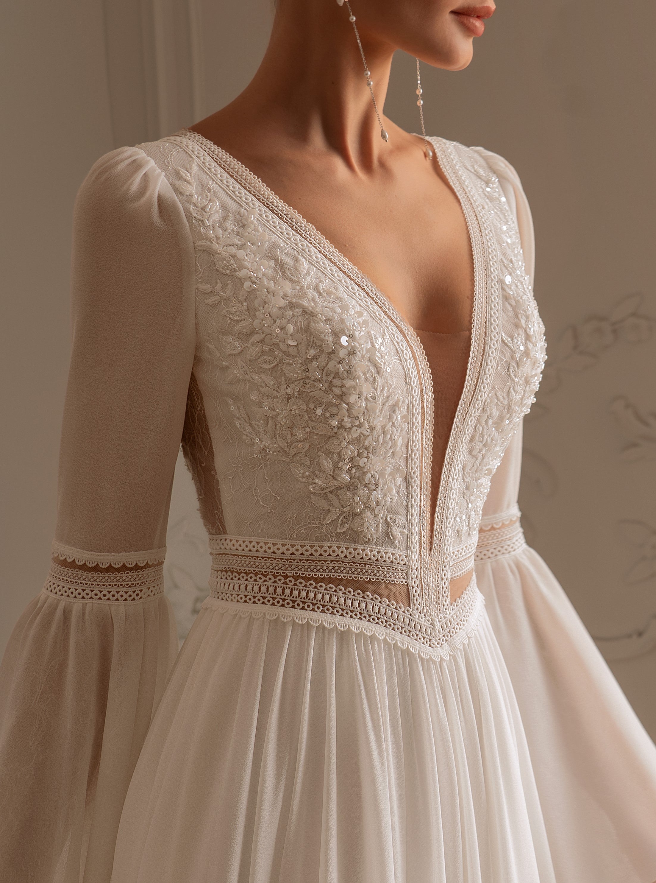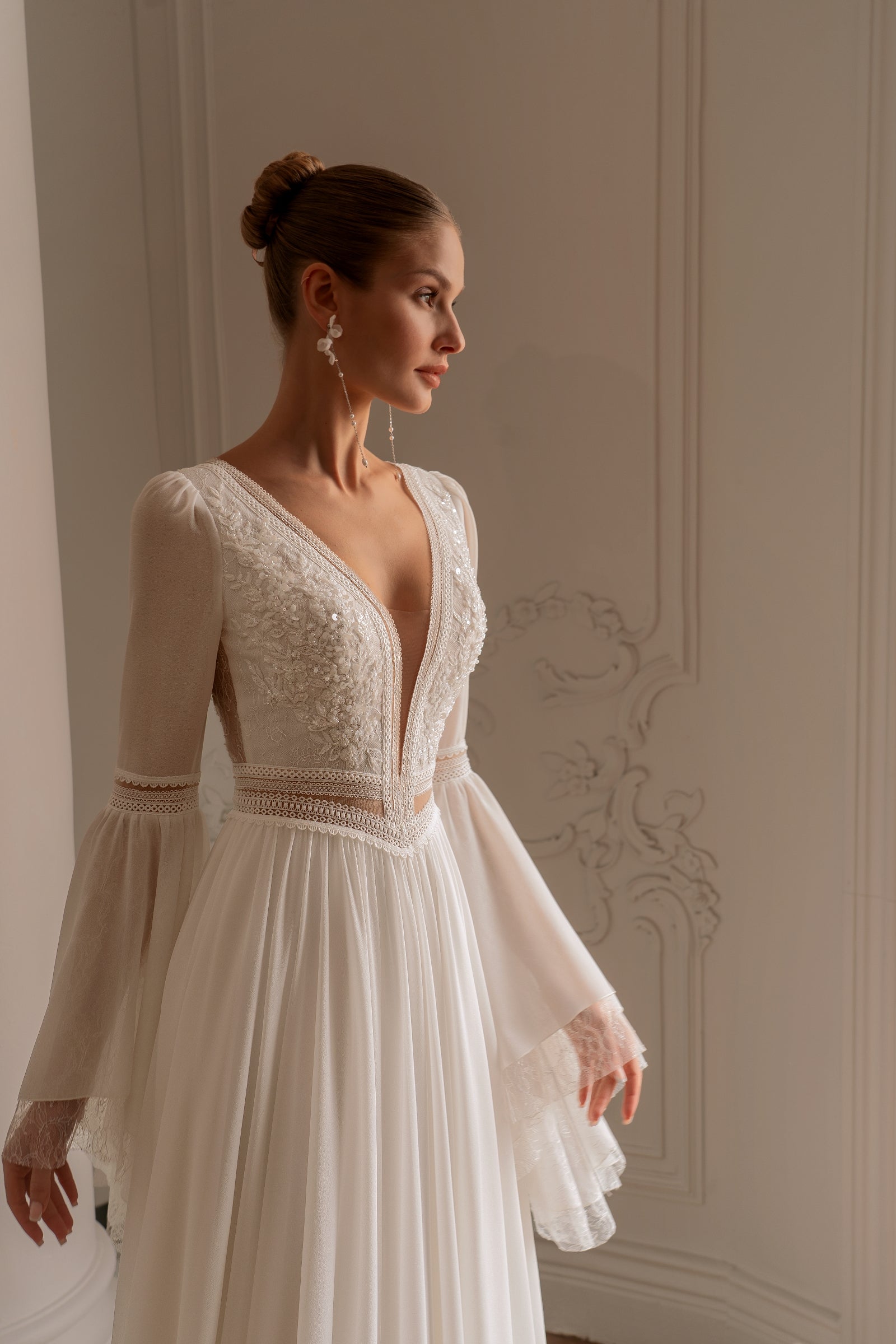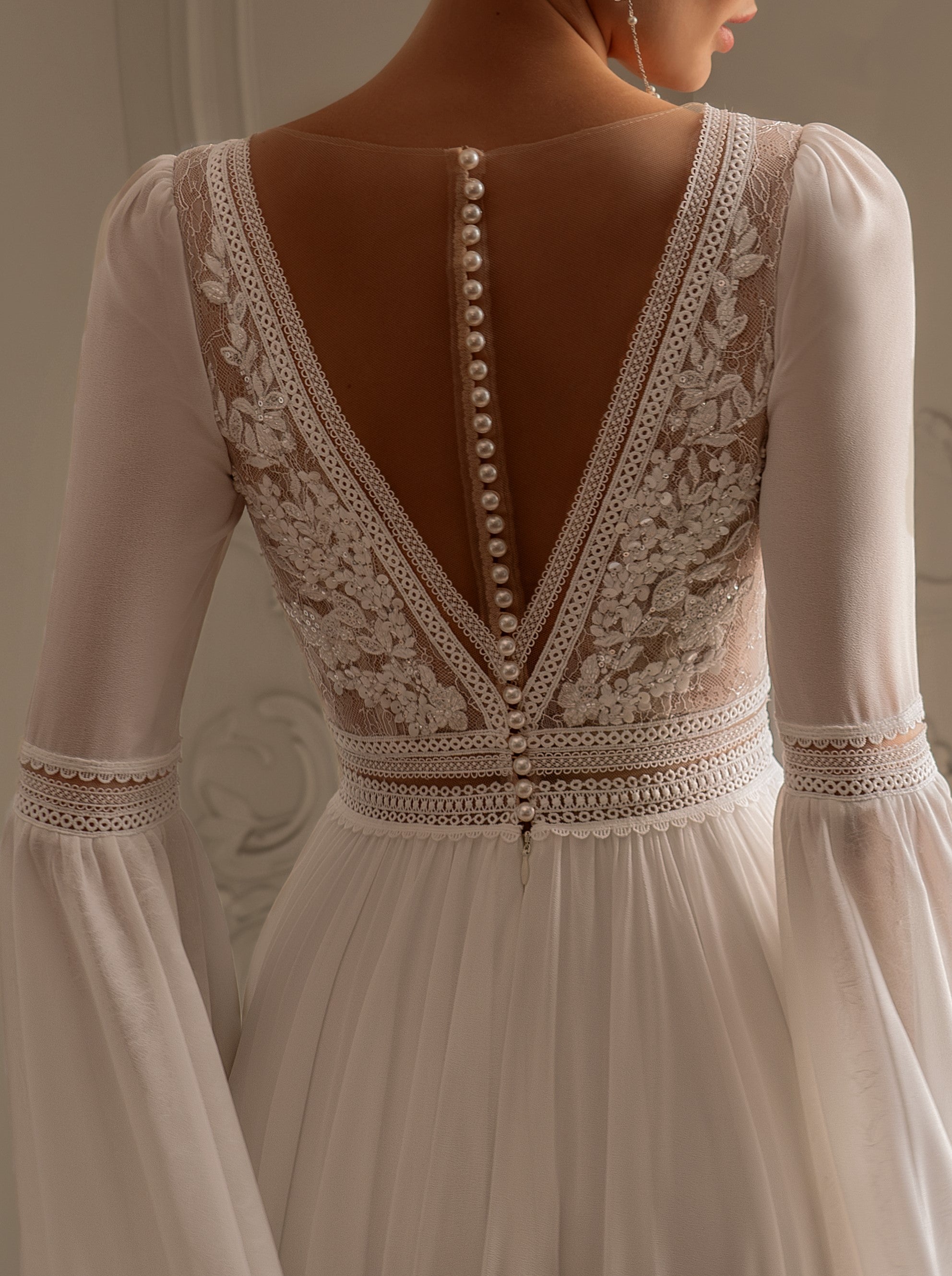 bohemian lace chiffon wedding dress, bell sleeve bridal gown, crepe chiffon wedding dress, romantic boho silhouette, long sleeve lace bridal dress, vintage-inspired boho gown, deep v-neck chiffon gown, handmade couture wedding dress, flowy chiffon bridal silhouette, ethereal bohemian bride