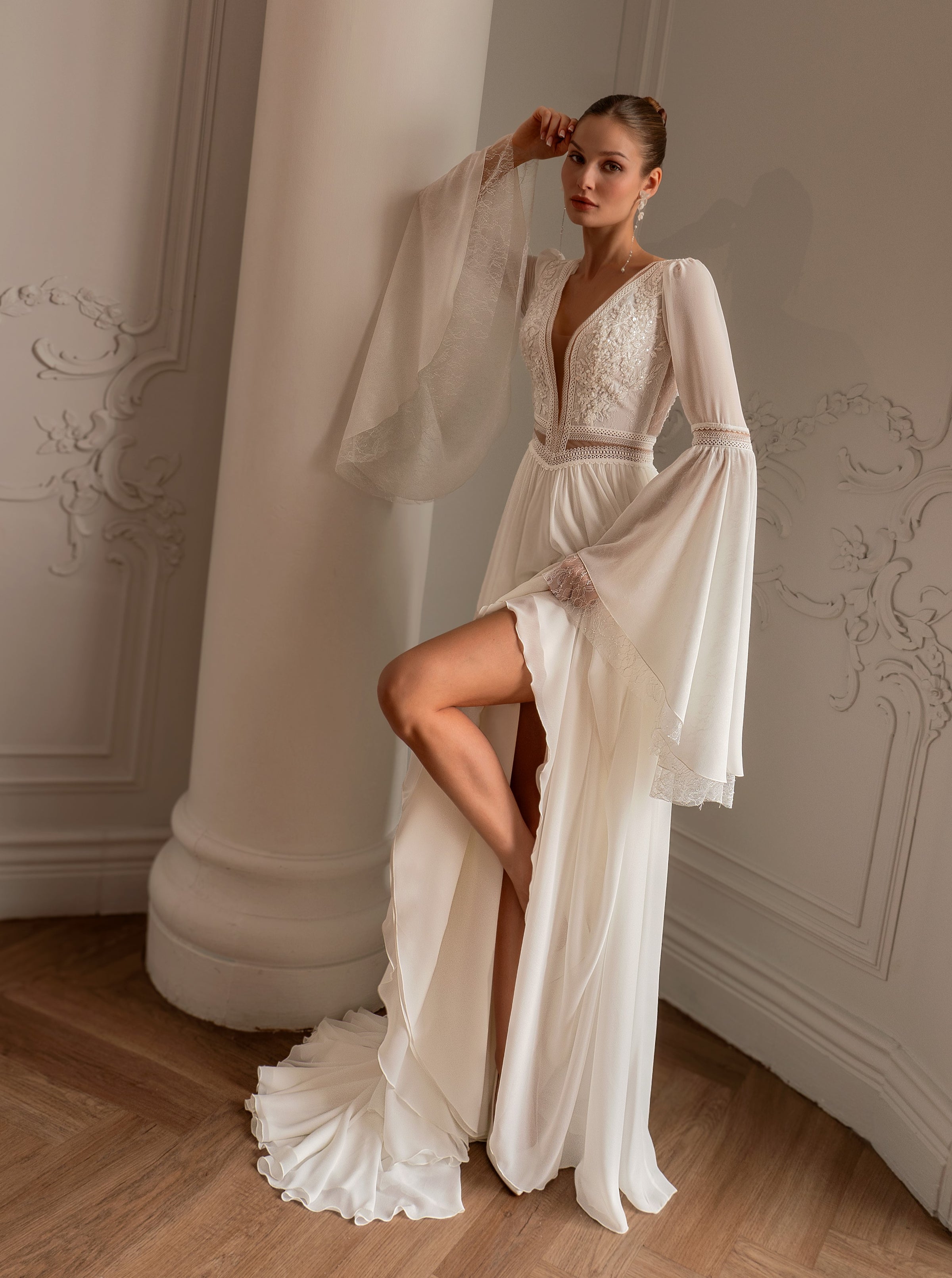 Bohemian Lace Chiffon Wedding Dress with Bell Sleeves | Ethereal Vintage Silhouette