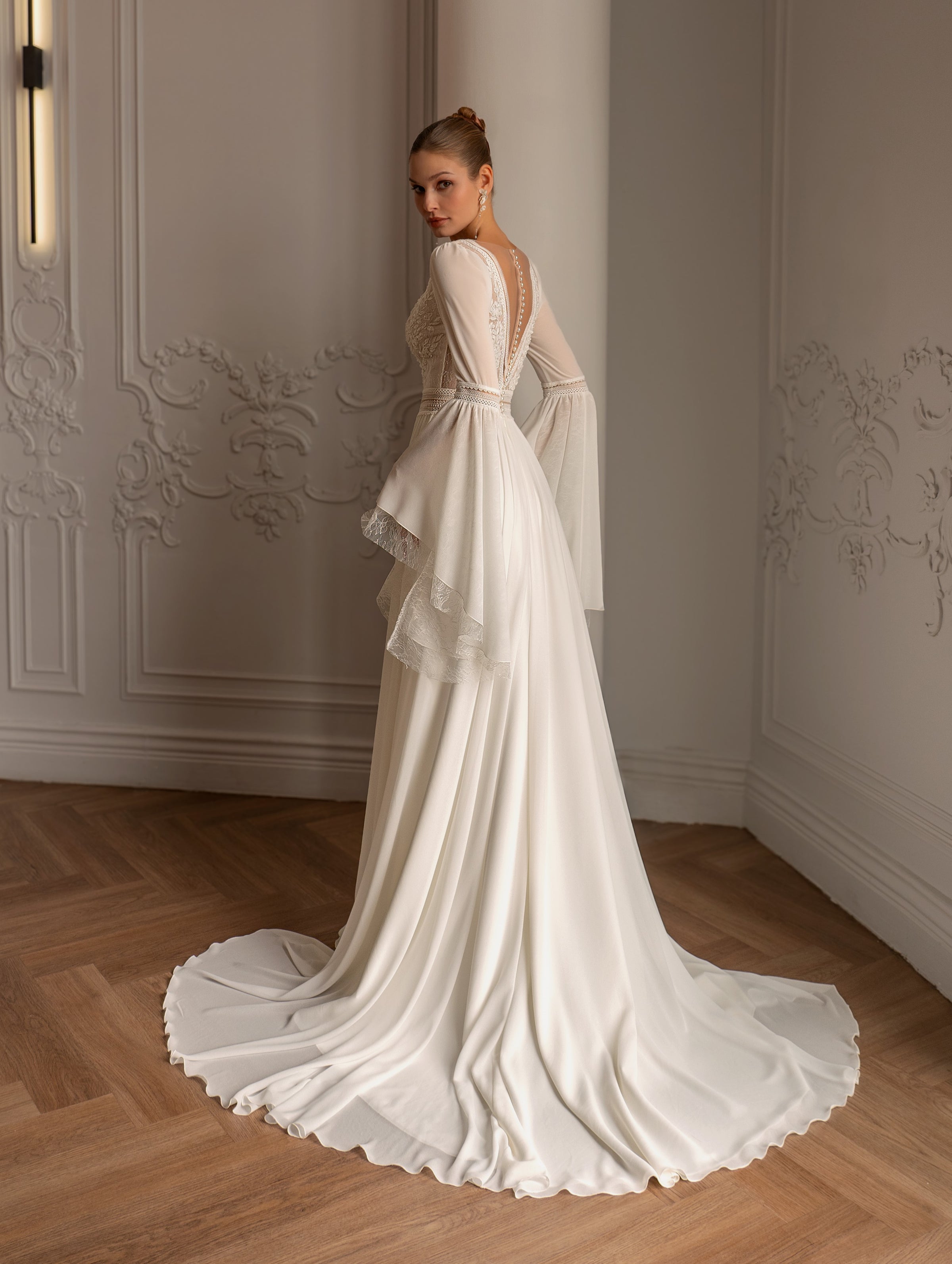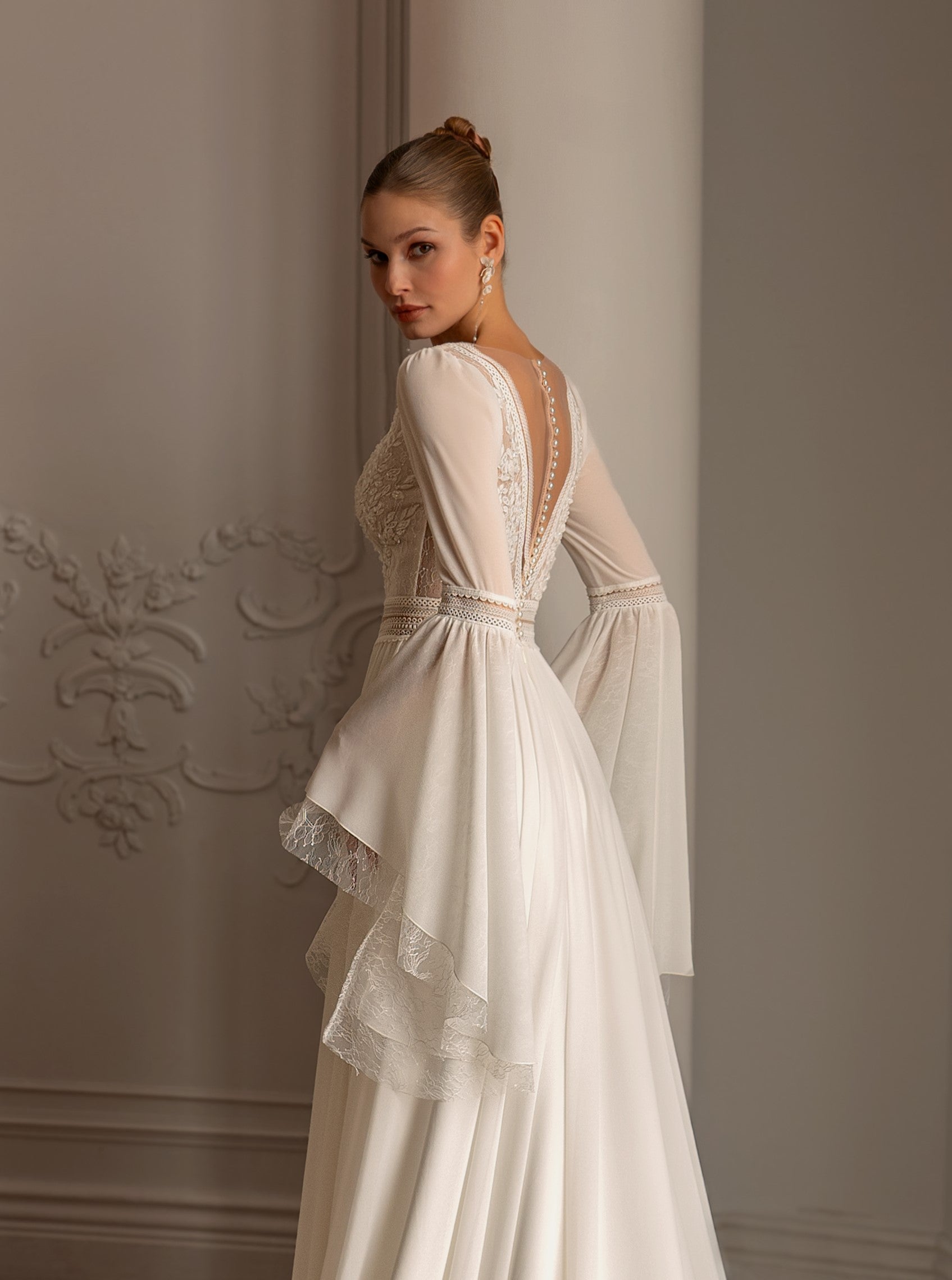 The dramatic bell sleeves with lace-trimmed edges evoke timeless grace, while the back illusion panel adorned with pearl buttons adds a touch of couture sophistication.
