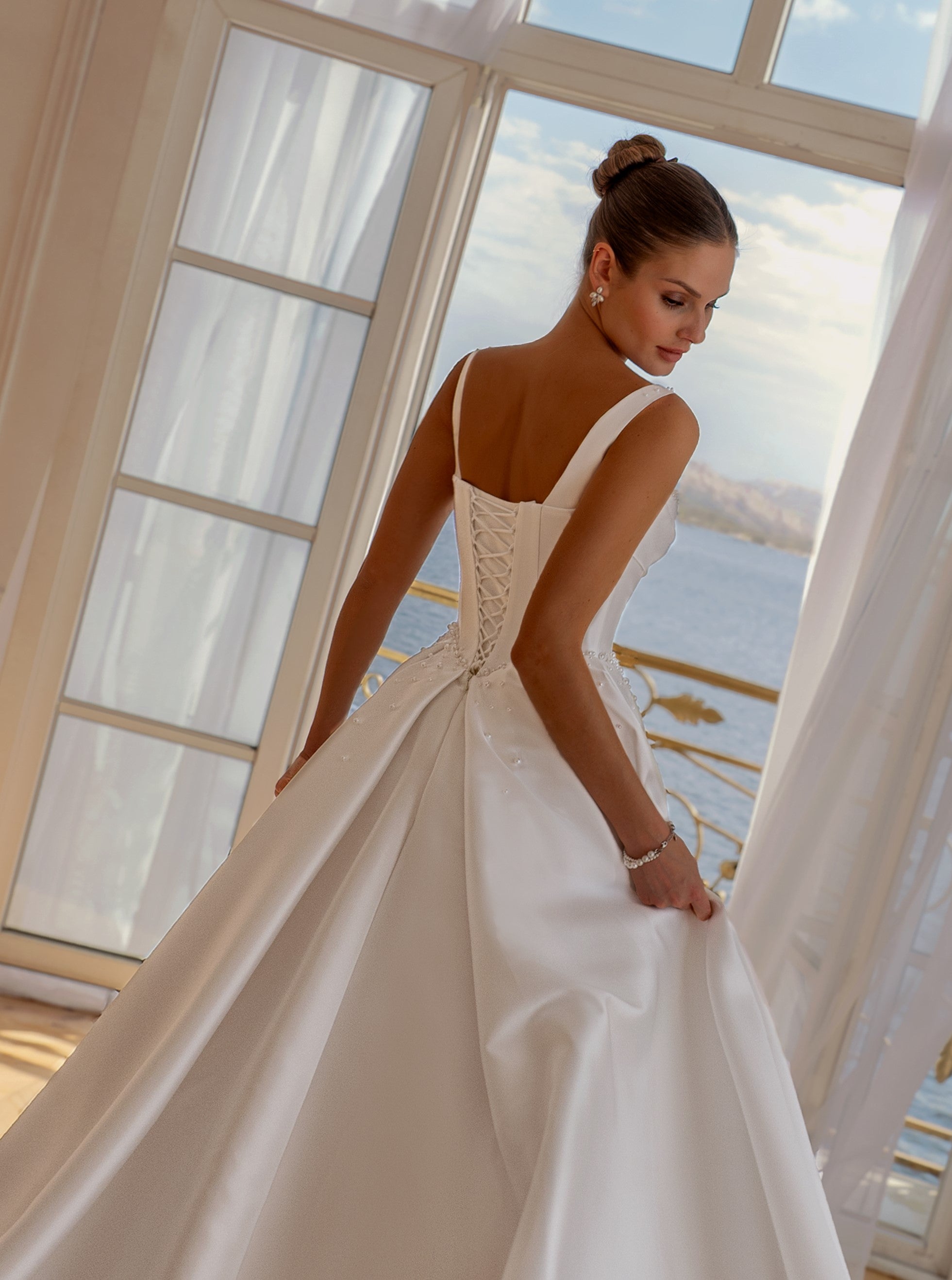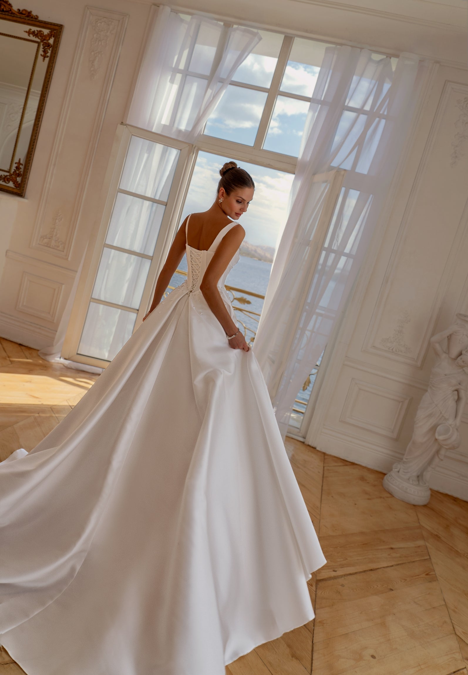 Crafted from sumptuous Mikado satin, this gown radiates subtle sheen and regal structure.