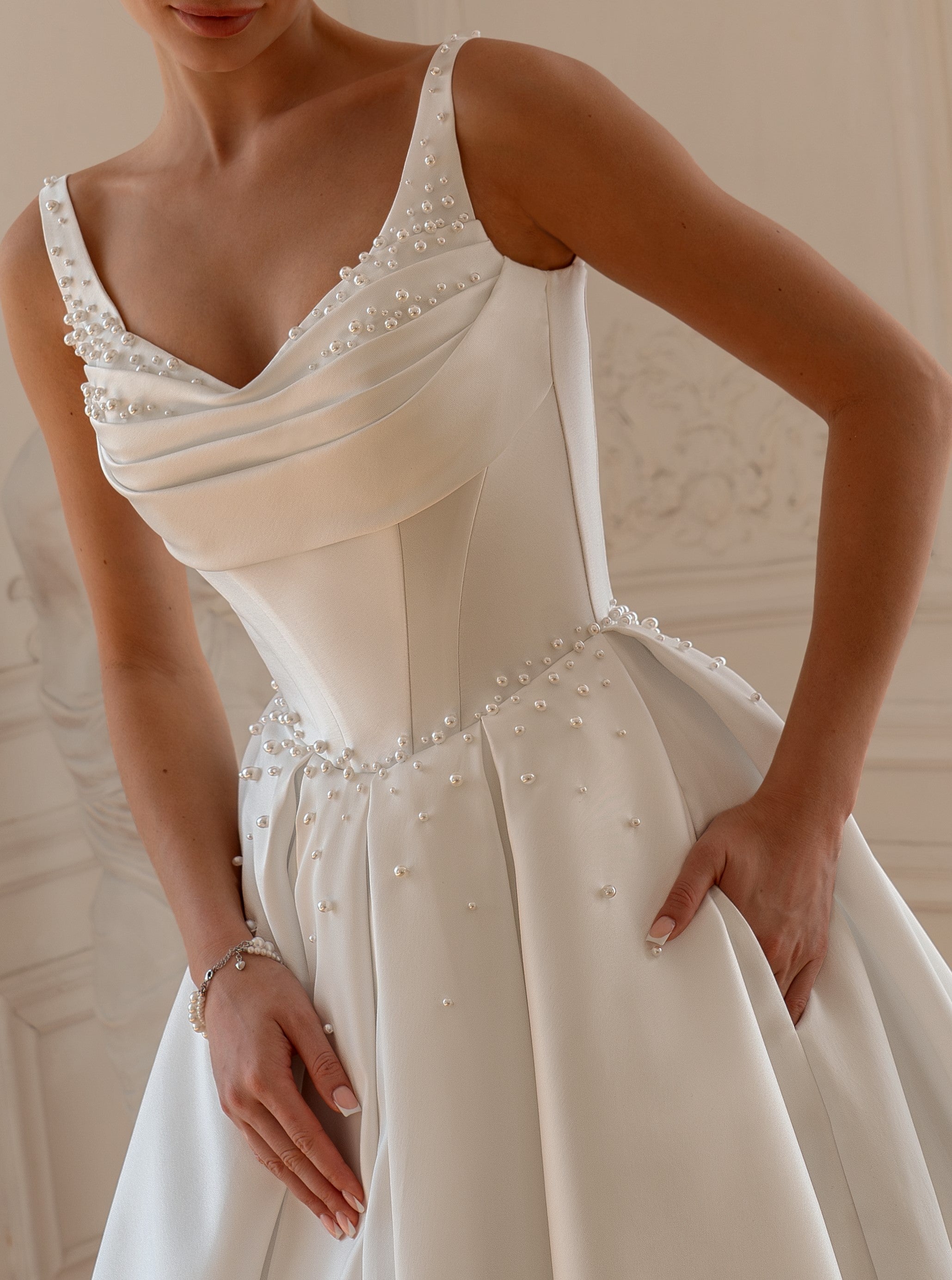The pleated bodice features a soft draped neckline, adorned with delicate pearls that continue down to the waistline — creating a refined sparkle under the light.