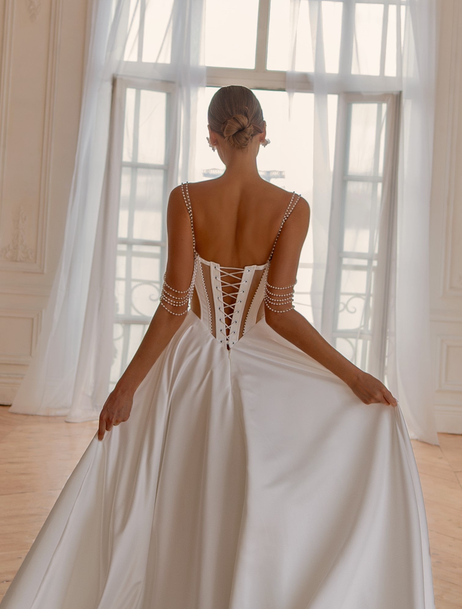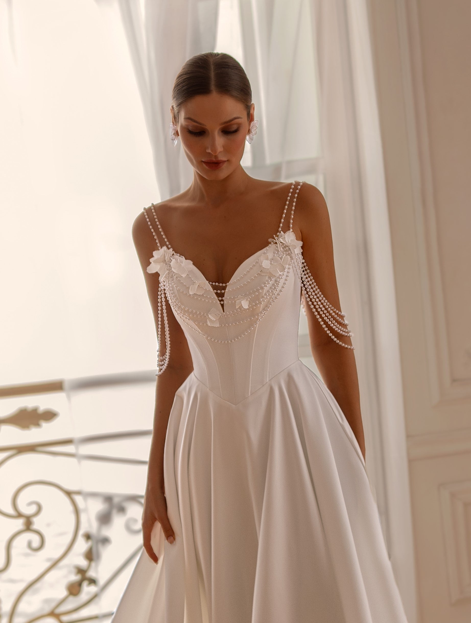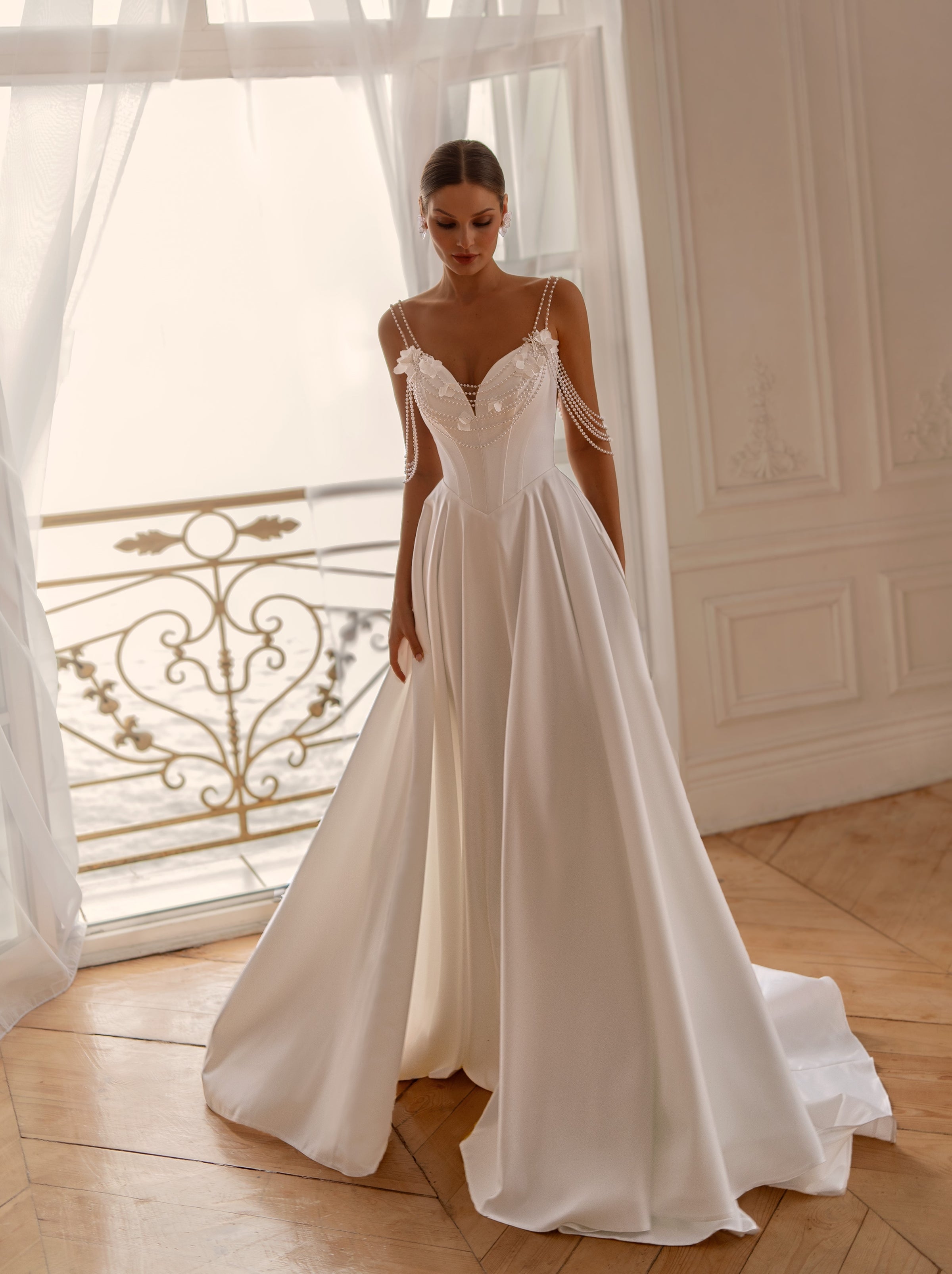 Flowing into a full satin A-line skirt, the gown captures effortless movement and light. Its corset back adds a touch of classical elegance, while the pearl straps draping softly over the arms create a whisper of glamour with every step.
