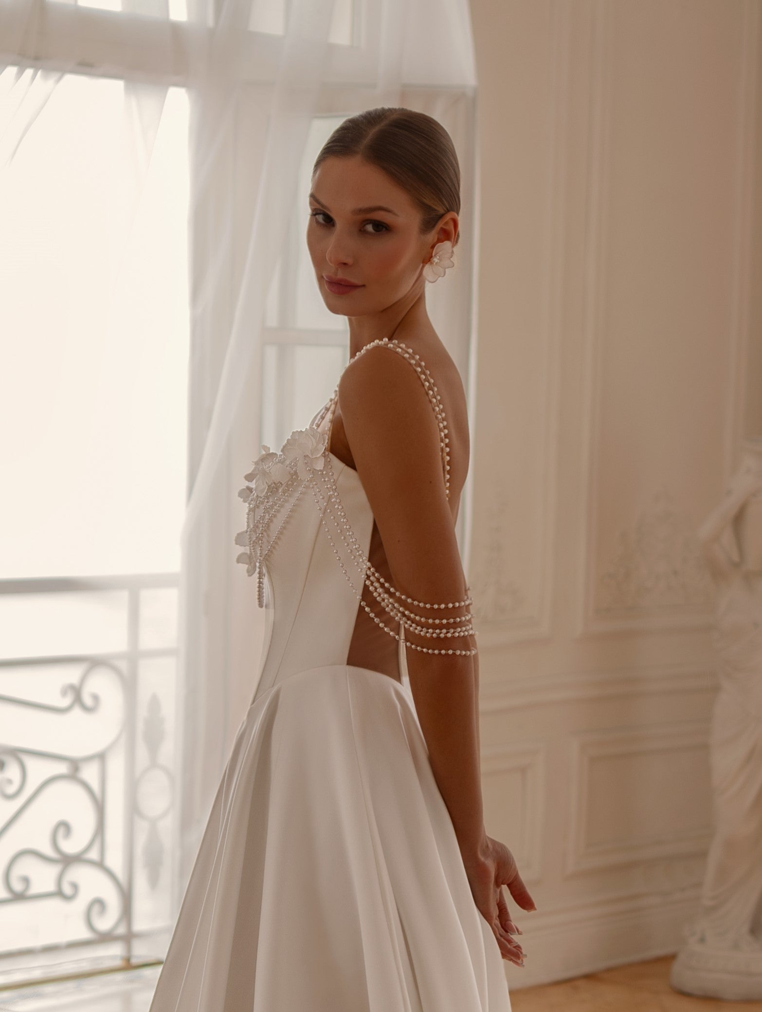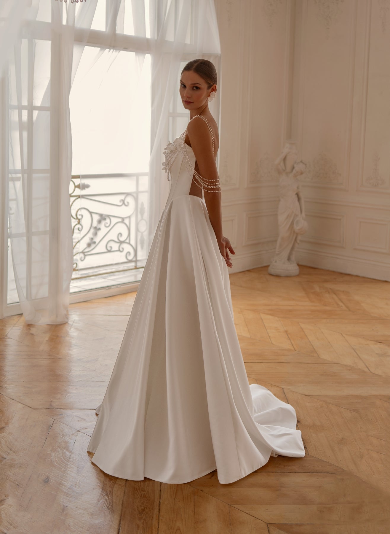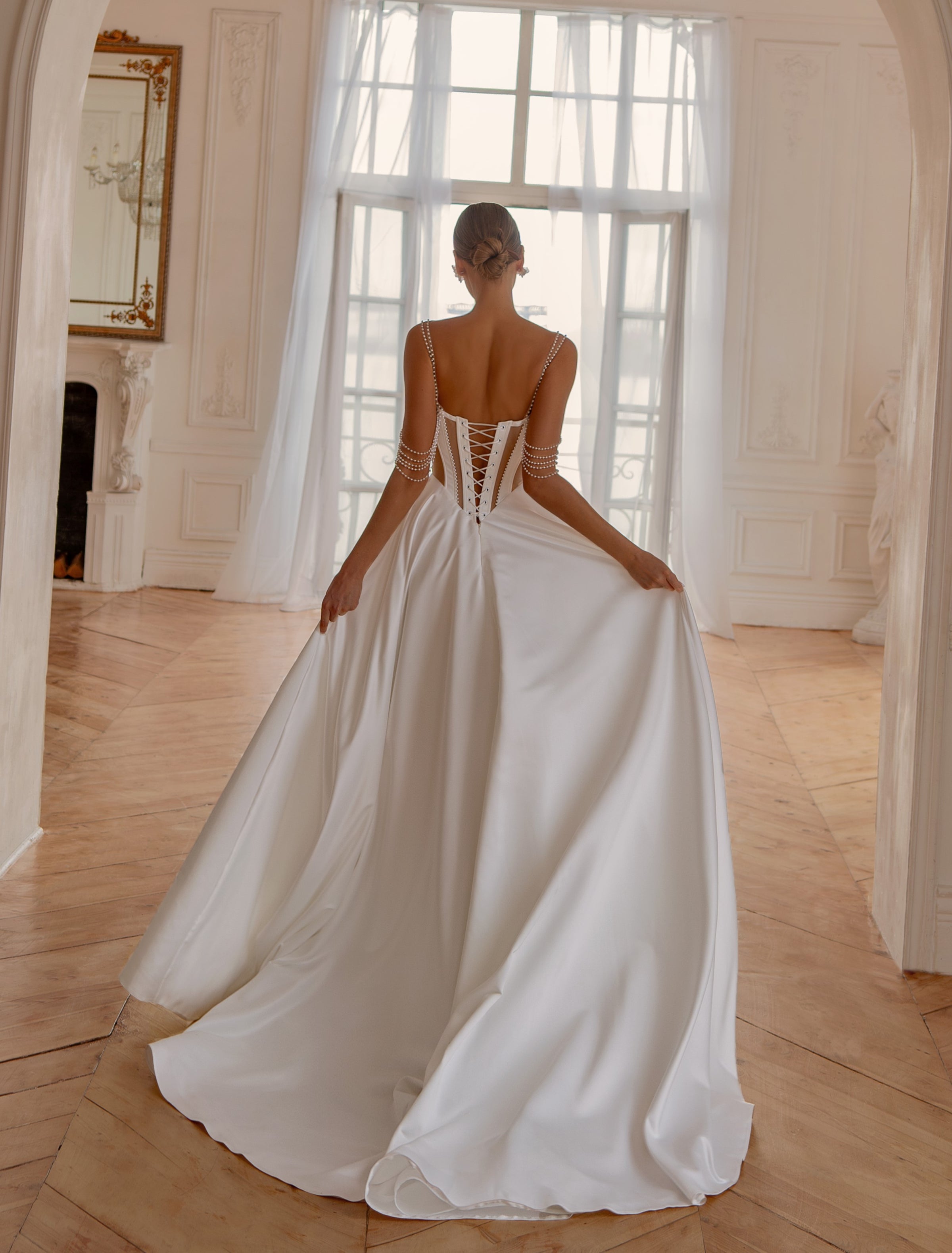 Flowing into a full satin A-line skirt, the gown captures effortless movement and light. Its corset back adds a touch of classical elegance, while the pearl straps draping softly over the arms create a whisper of glamour with every step.