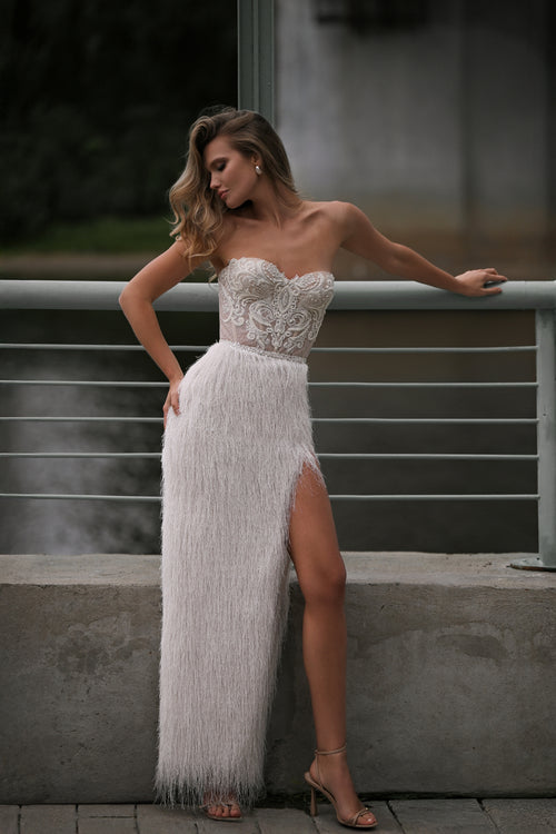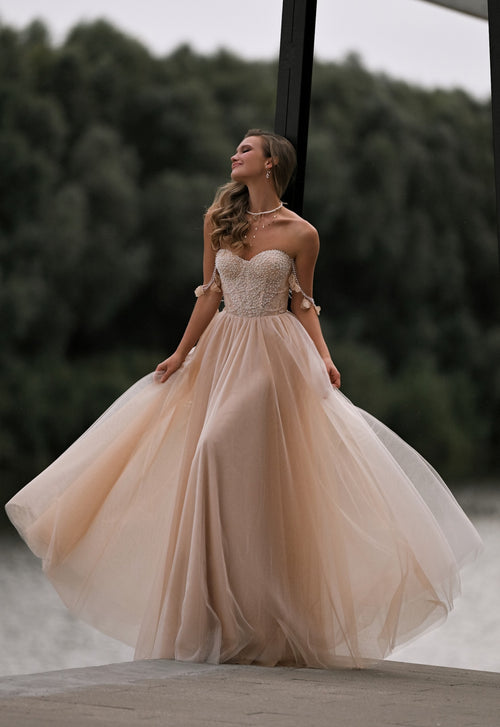 Windswept Romance is a celebration of movement, emotion, and modern femininity. Shot on a riverside promenade beneath steel bridges and open skies, each gown is designed to look alive in the wind – silk and crepe streaming behind you, euro tulle and chiffon catching the light with every step. From sculpted corset bodices and asymmetric necklines to fluid skirts that swirl around the legs, the silhouettes flatter the body while keeping the mood effortless, young, and irresistibly romantic.
