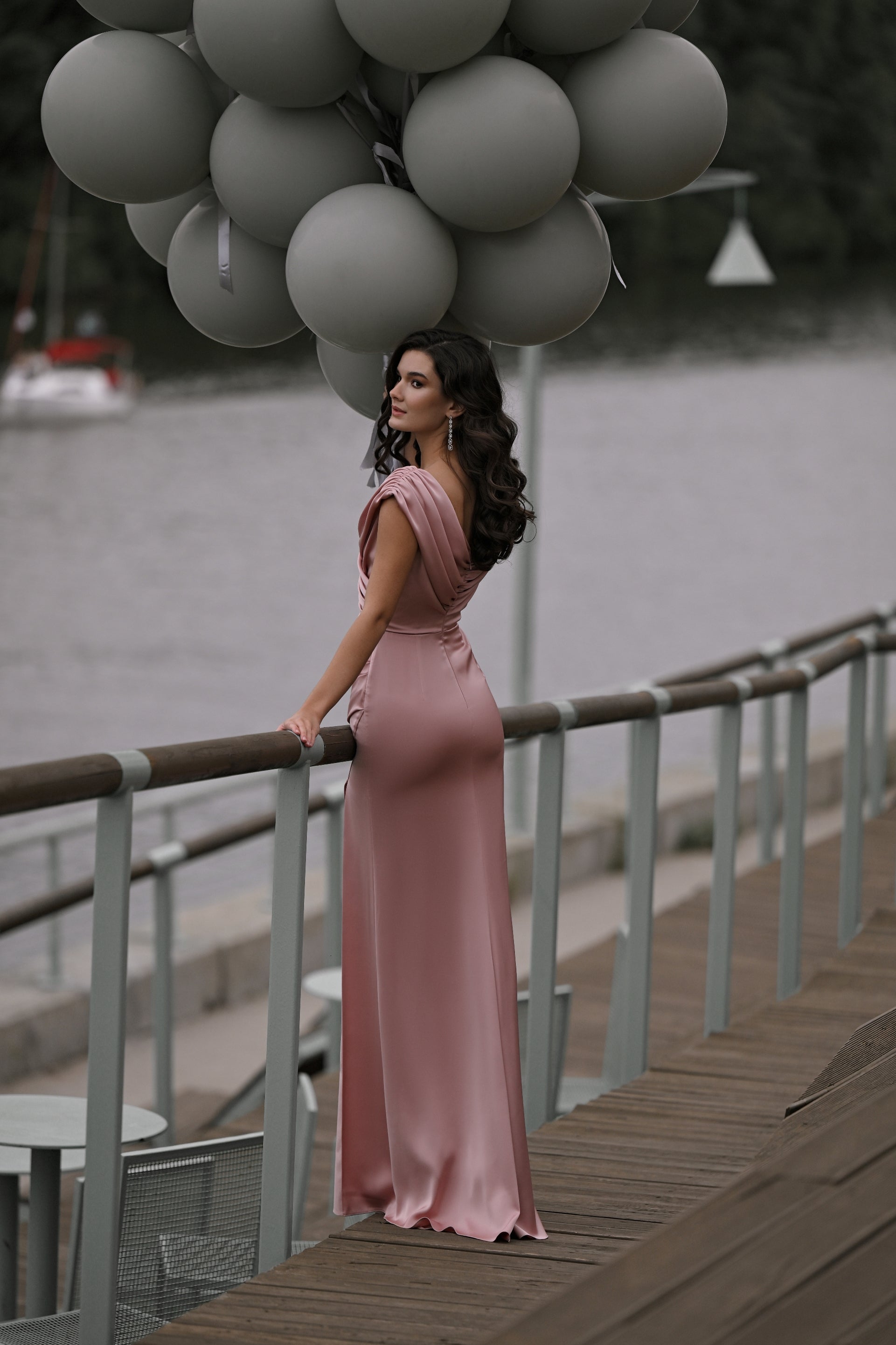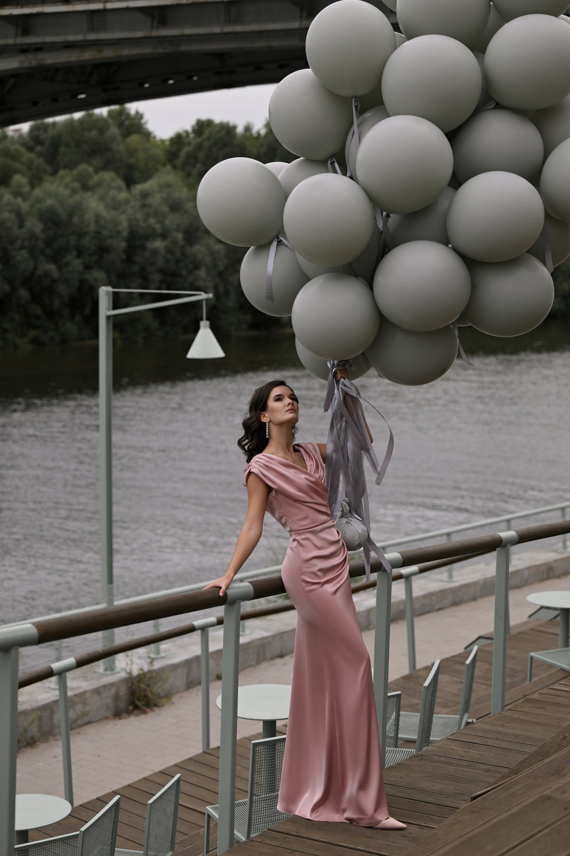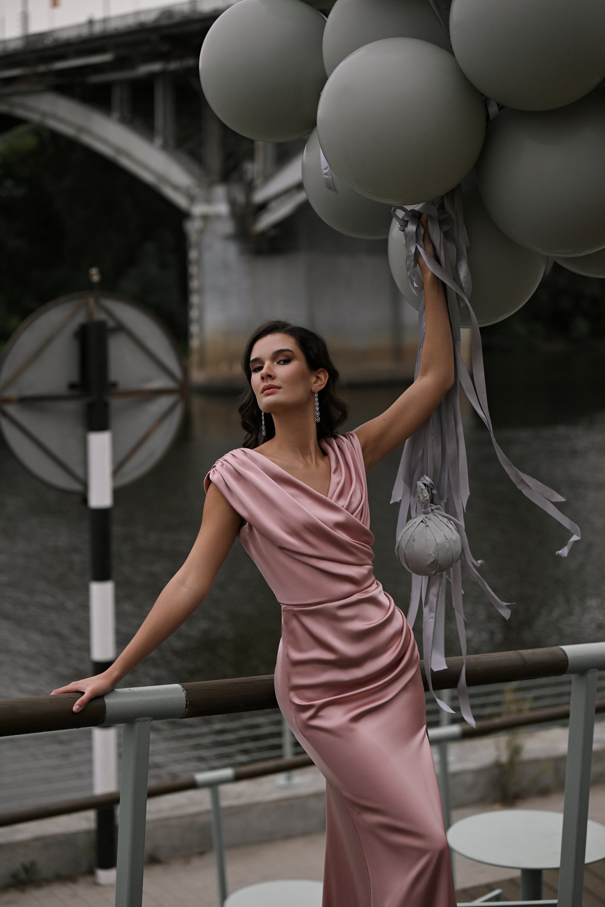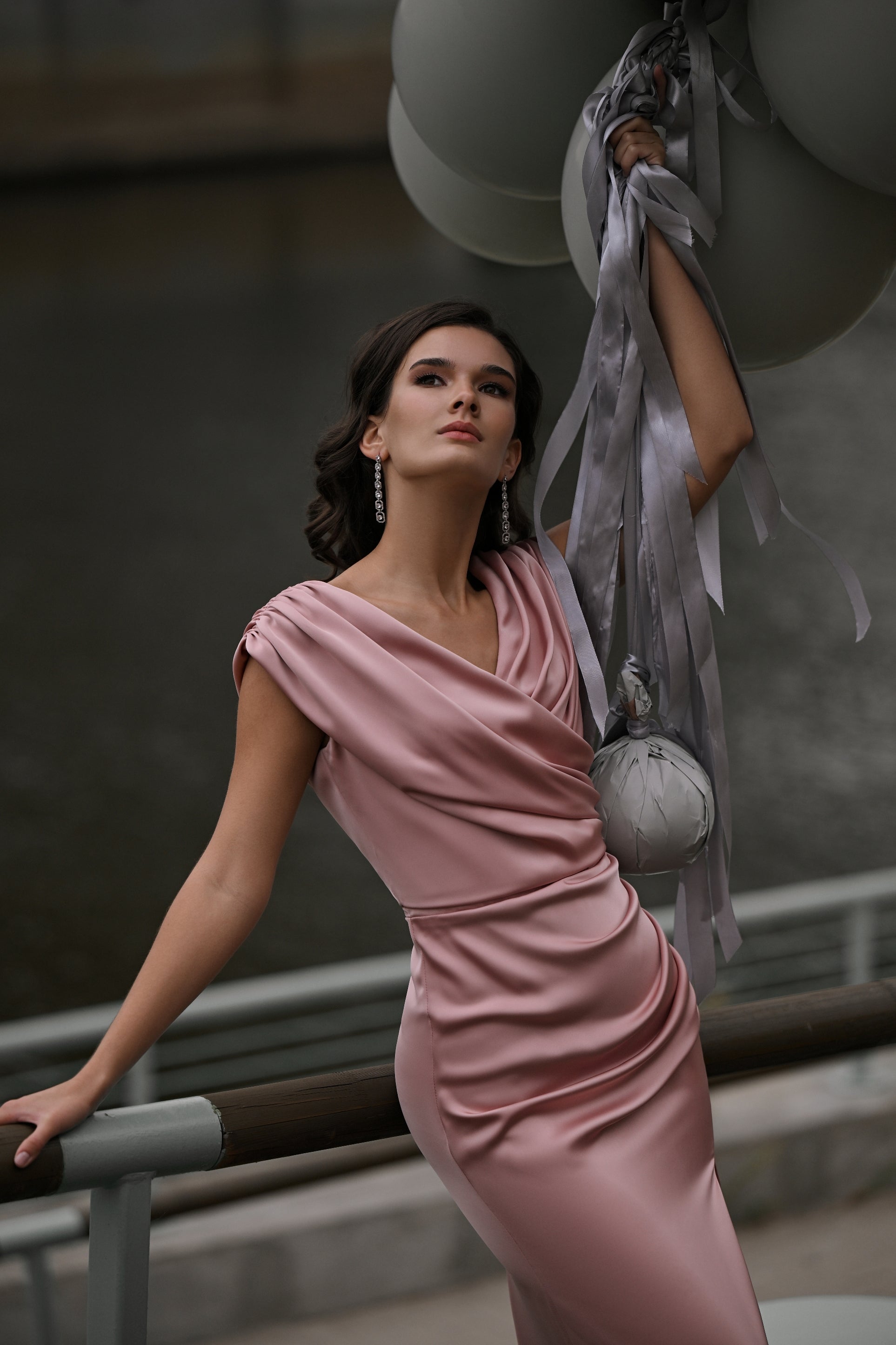 A celebration of soft glamour — this draped silk evening dress skims the body with liquid elegance.
