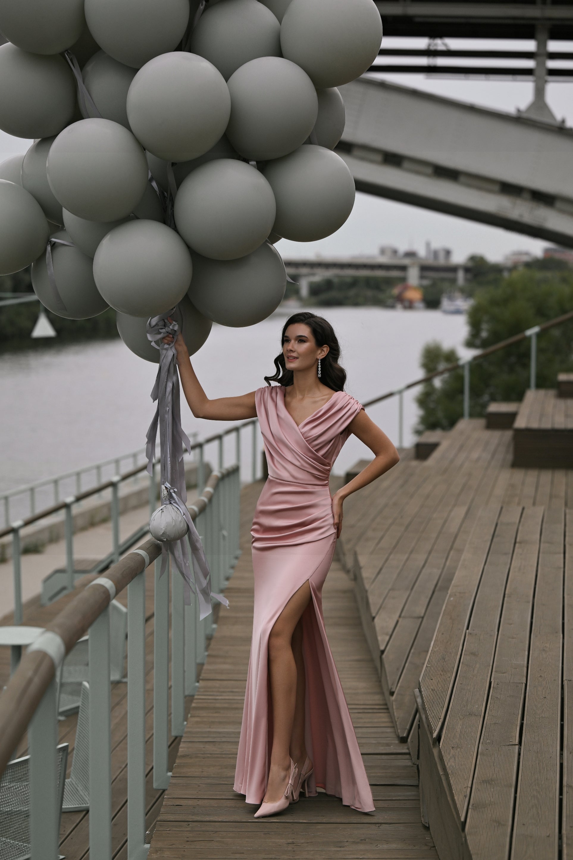 Design: Fitted draped evening dress with wrap-effect bodice and high slit