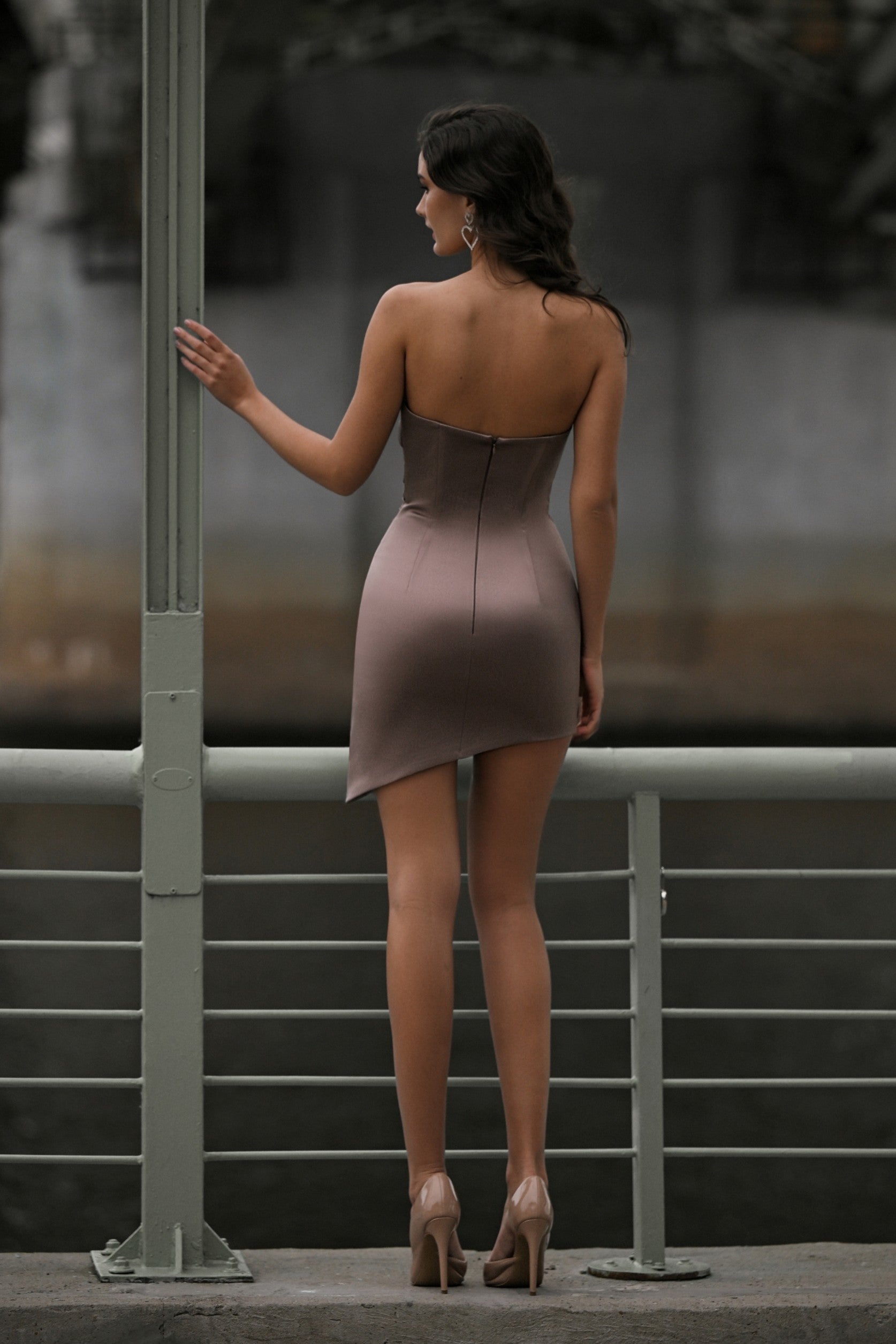 A sleek, sculpting silhouette with two ways to shine in one look. This strapless satin mini is cut with an asymmetric hem that elongates the legs and gently ruched across the bodice for a smooth, flattering line through the waist and hips. Worn alone, it creates a modern, ultra-feminine cocktail look.