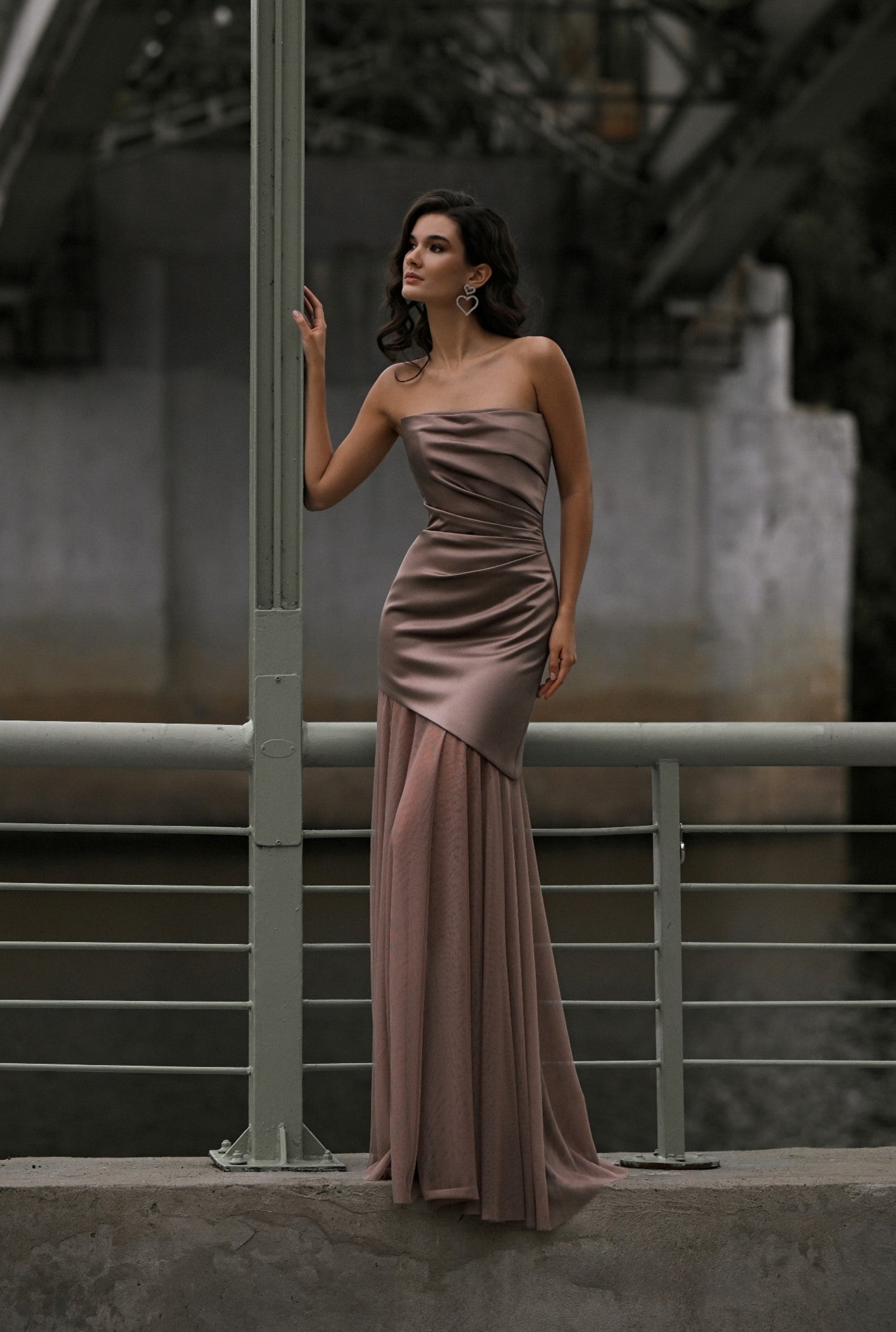 2 in 1 evening dress, strapless satin mini dress, detachable tulle overskirt gown, mocha evening gown, black party dress, asymmetrical hem cocktail dress, modern prom dress, elegant wedding guest outfit, red carpet inspired dress, robe de soirée bustier, robe deux pièces tulle, vestido de fiesta 2 en 1, vestido corto con sobrefalda larga, abito da sera in raso, abito bustier con gonna in tulle, iki parçalı abiye elbise, straplez mini abiye, فستان سهرة قطعتين, فستان قصير مع تنورة تول طويلة, ストラップレスミニドレス, チュールオーバースカートドレス.
