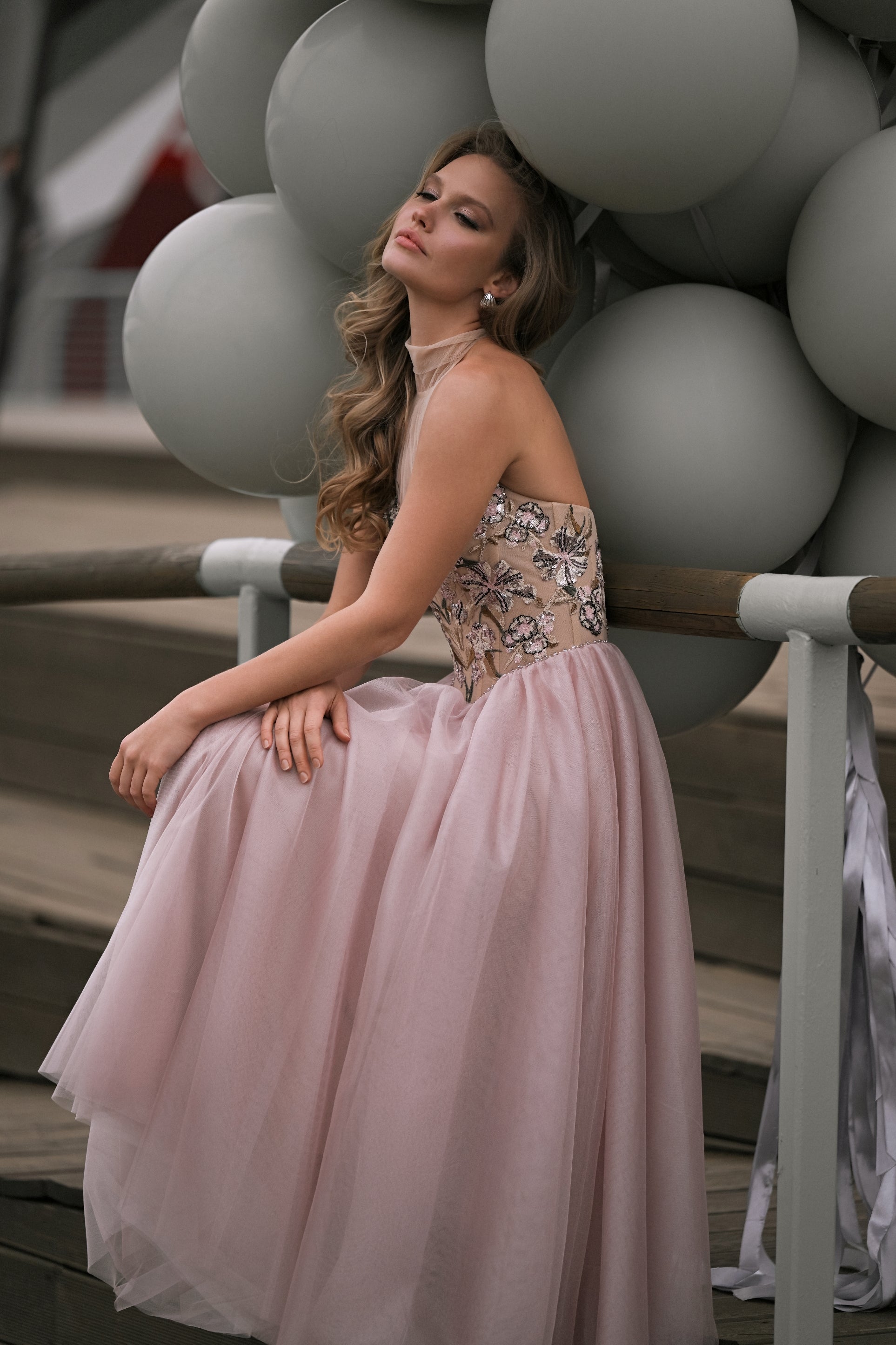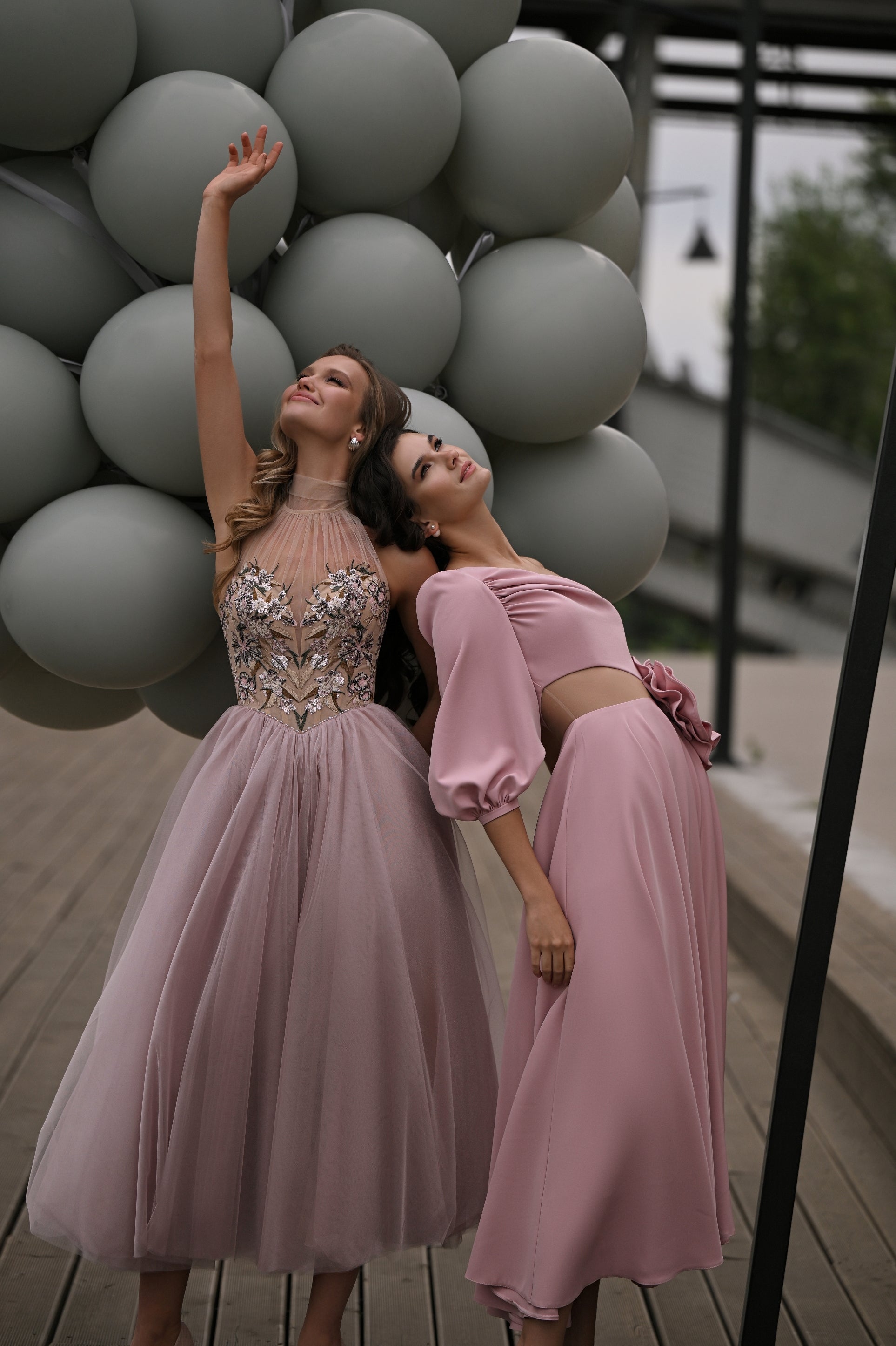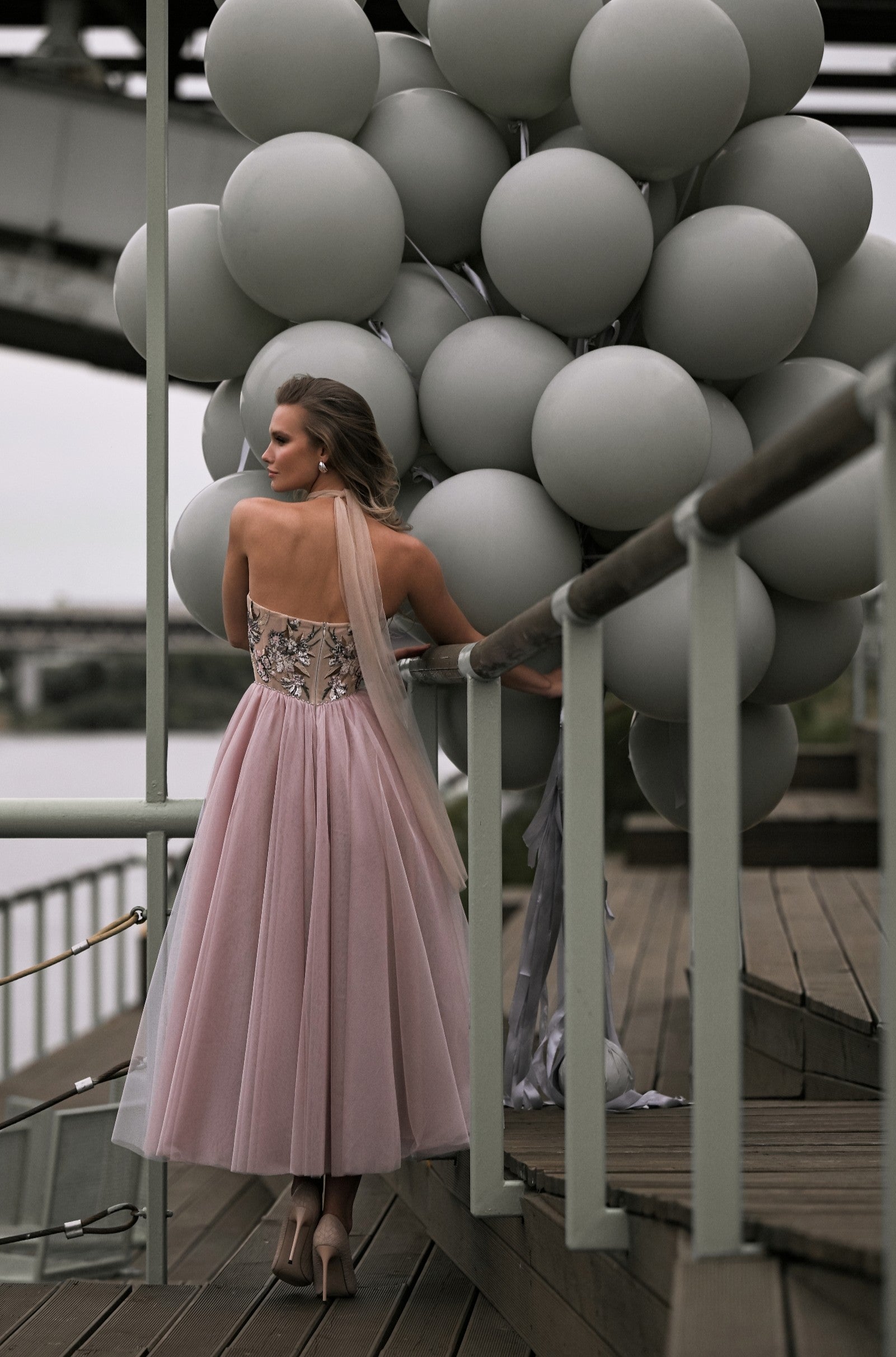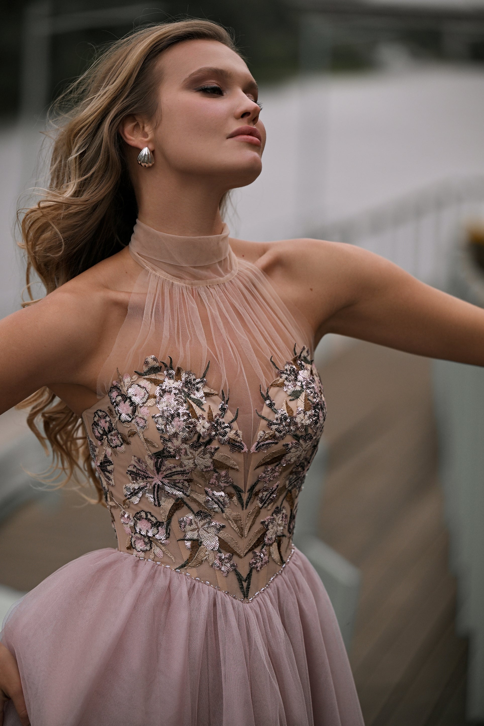 illusion halter midi dress, embroidered tulle evening dress, floral lace bodice gown, tea length party dress, romantic powder pink dress, corset style formal dress, soft tulle prom dress, elegant engagement outfit, special occasion midi gown, robe de soirée en tulle, robe midi bustier brodé, vestido de fiesta de tul, vestido midi con cuello halter, abito da cerimonia in tulle, abito midi con corpetto ricamato, midi abiye tül elbise, çiçek işlemeli abiye elbise, فستان سهرة تول مطرز, فستان ميدي بياقة هالتر شفافة, チュールミディドレス, 幻想的なハルターネックドレス.
