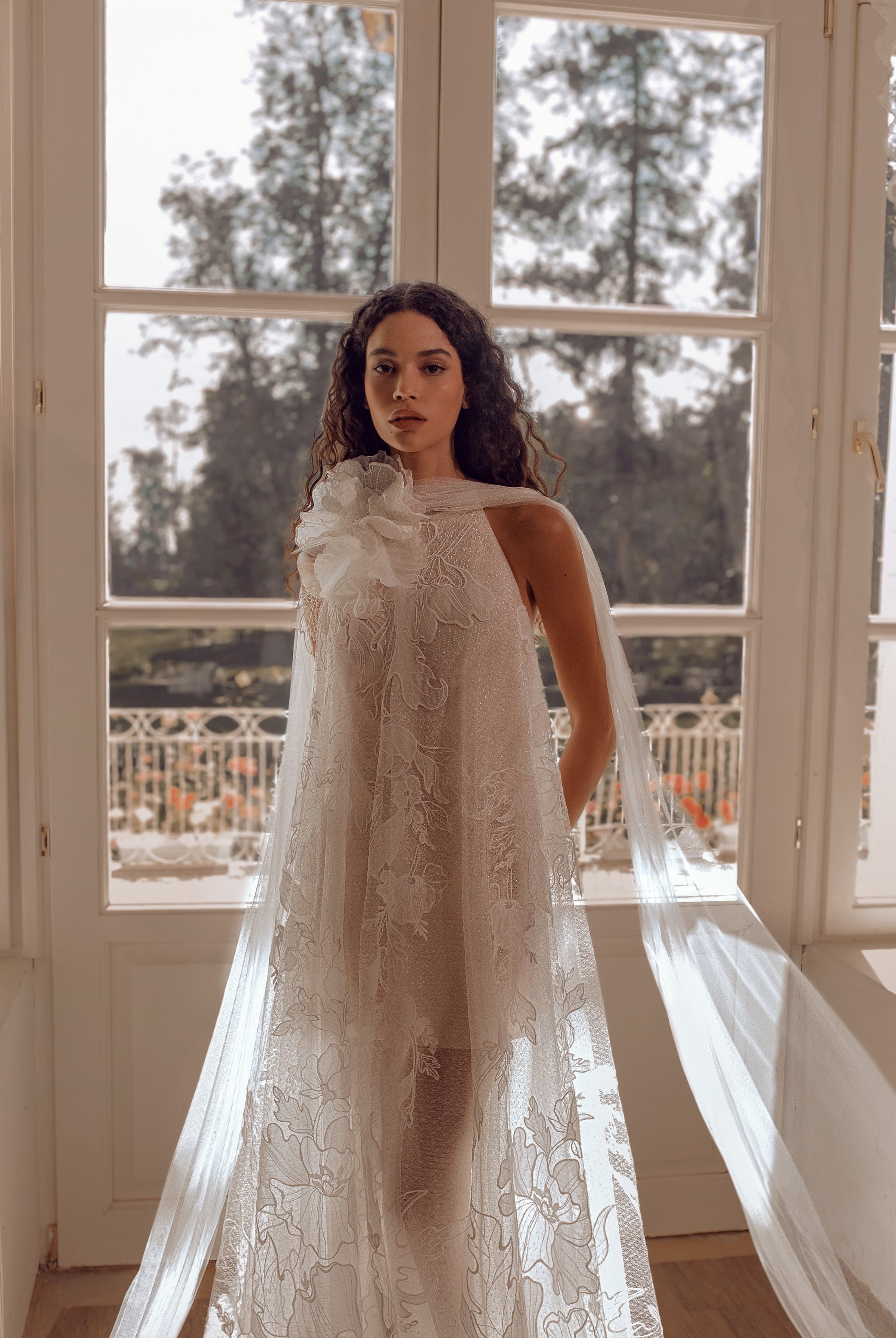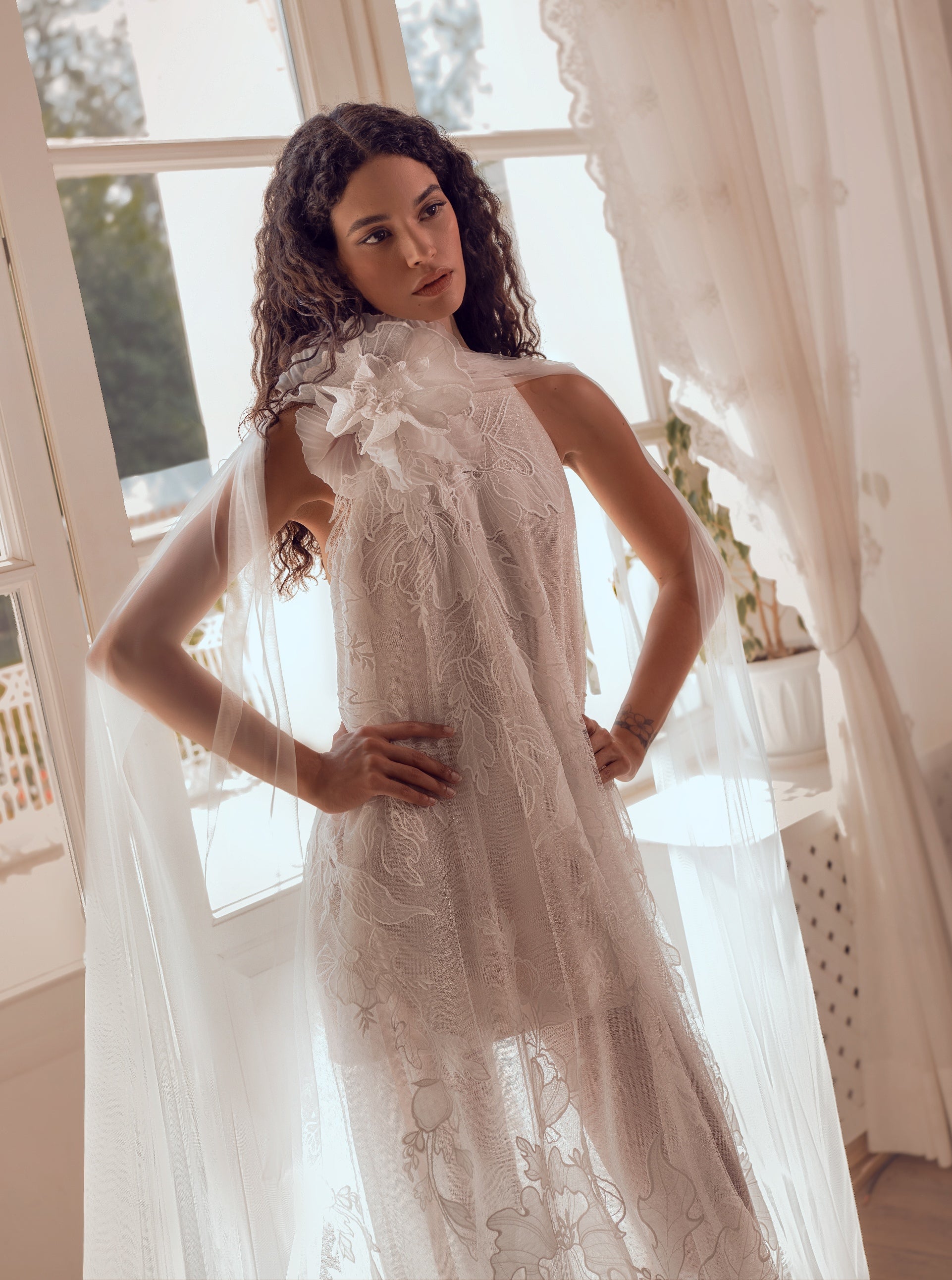 A sculptural floral appliqué blooms delicately at the neckline, while the fluid cape panels create a celestial aura with every step — blending refinement and modern romanticism in perfect harmony.