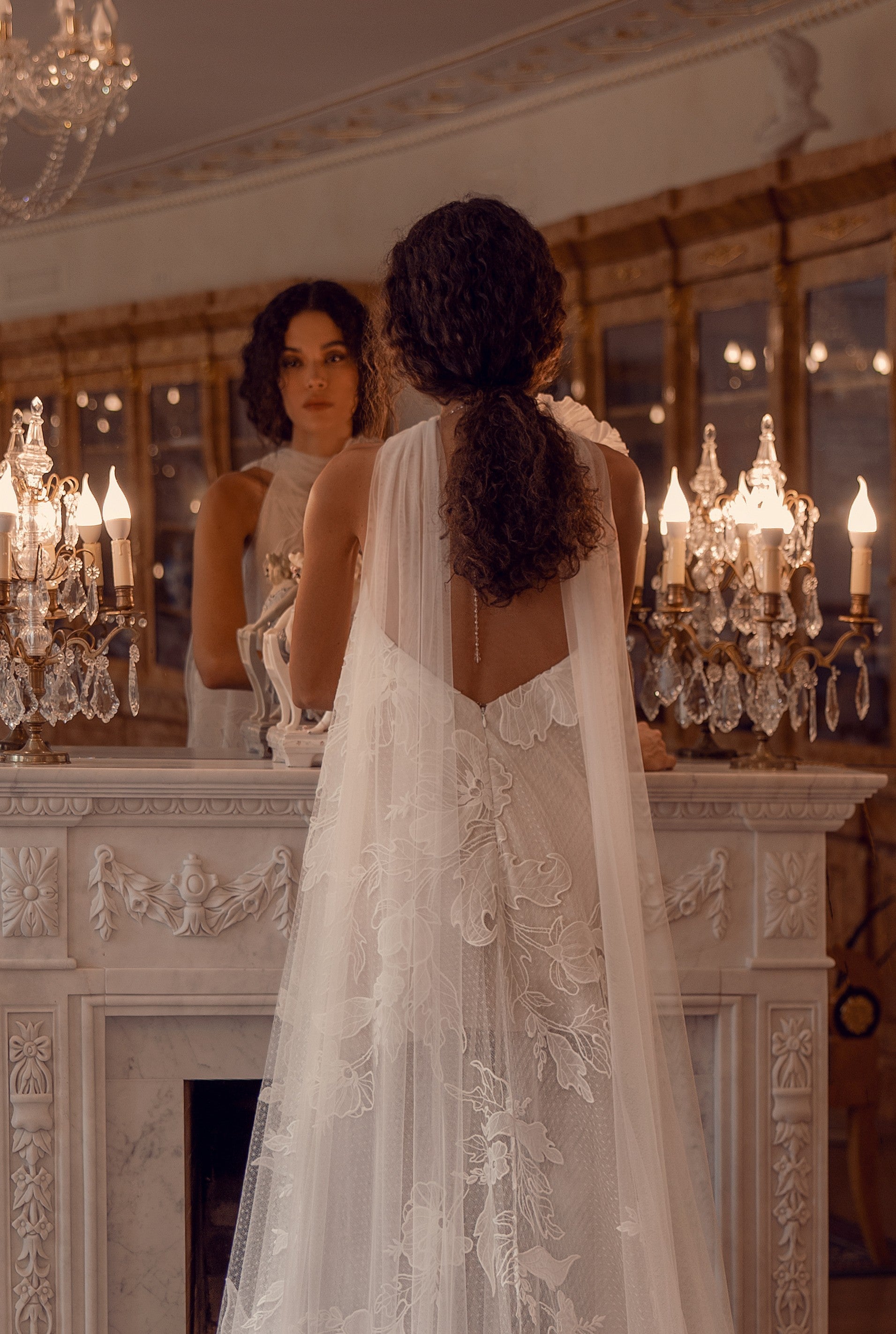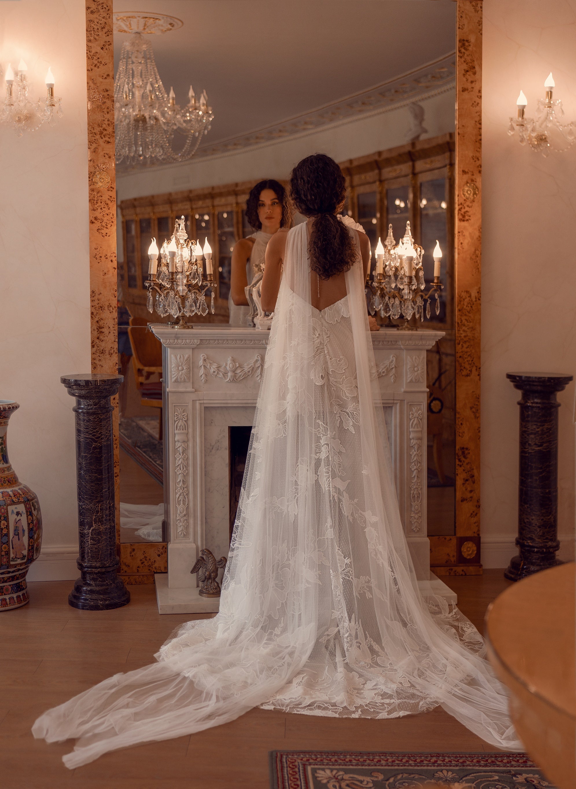 high-neck lace wedding dress, tulle cape bridal gown, floral applique wedding dress, sheer lace chapel train gown, couture lace high-neck gown, ethereal tulle bridal look, romantic lace cape dress, celestial wedding gown, robe de mariée dentelle col haut, vestido de novia con capa de tul, abito da sposa con collo alto in pizzo, dantelli tül pelerinli gelinlik, yüksek yaka gelinlik, فستان زفاف دانتيل برقبة عالية مع كاب, レースケープウェディングドレス, 高领蕾丝婚纱