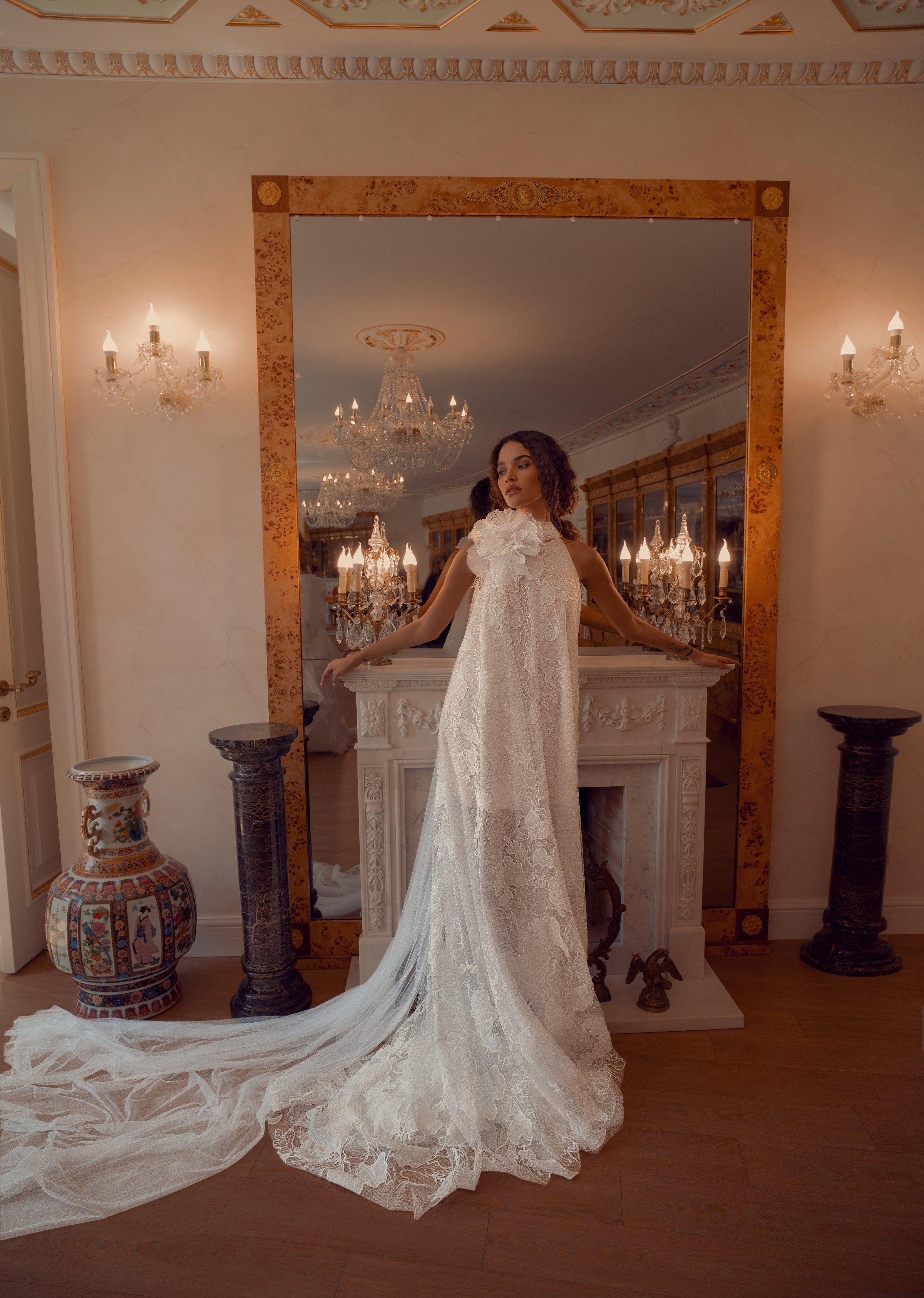 The high-neck lace silhouette drapes gracefully over the body, enveloped in layers of whisper-soft tulle that cascade into a sweeping chapel train.