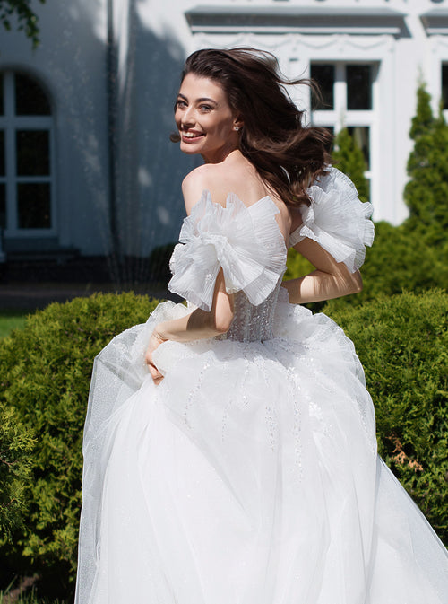 Vestido de novia con purpurina sirena y hombros descubiertos