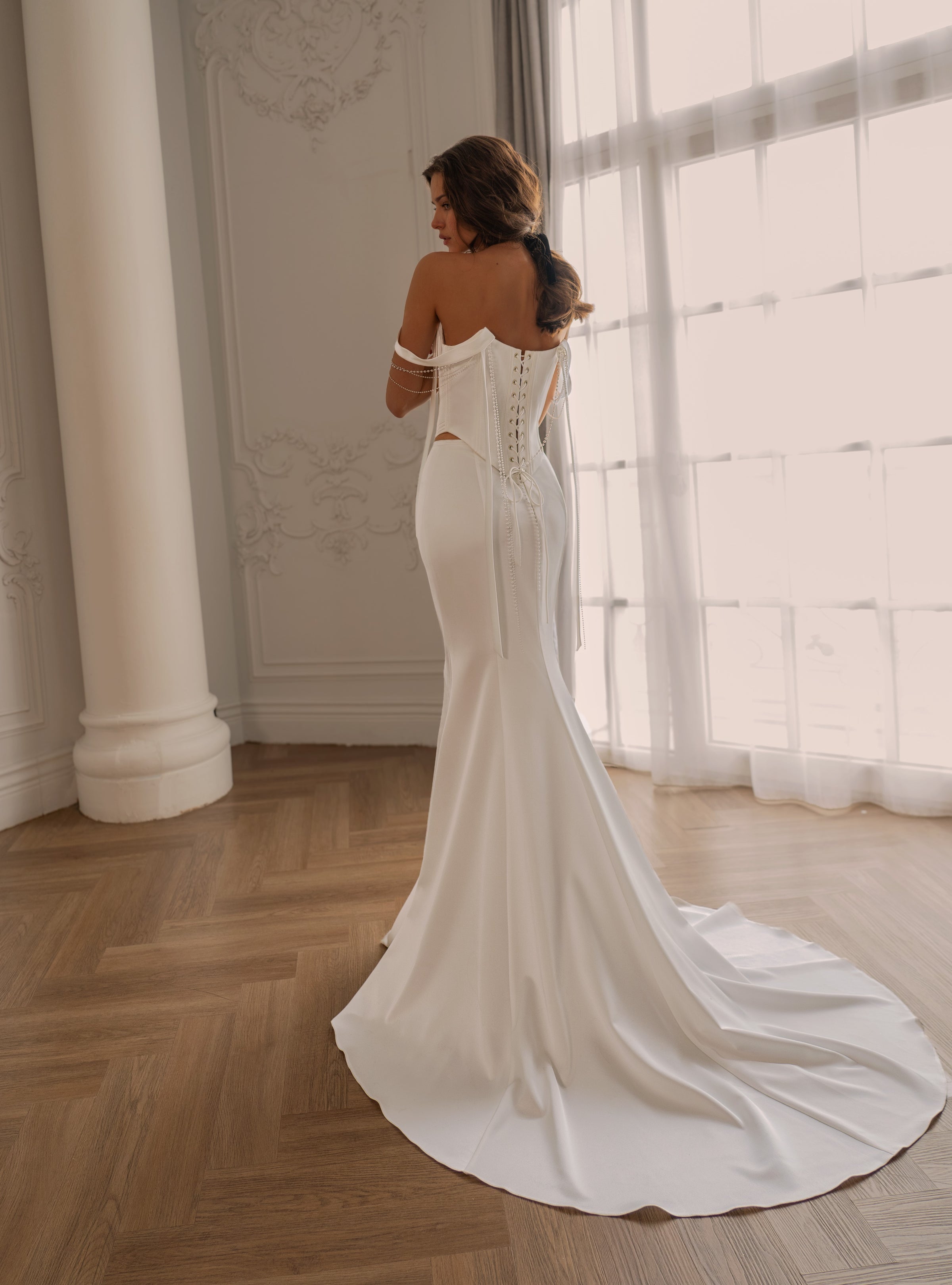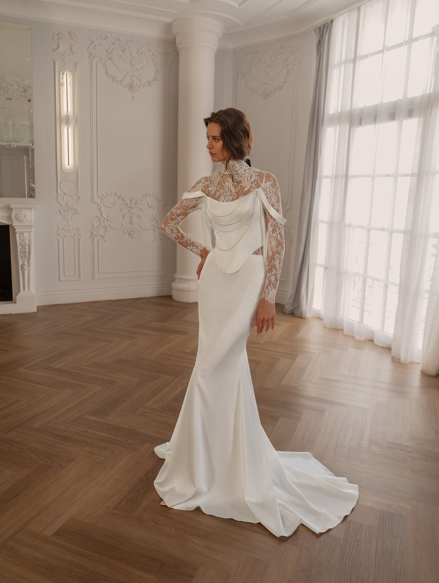 La sobrecapa de encaje, adornada con delicados motivos florales y cadenas de perlas drapeadas, añade sofisticación y textura. Una vez retirado, el corsé revela la gracia natural de la novia con un encanto contemporáneo.
