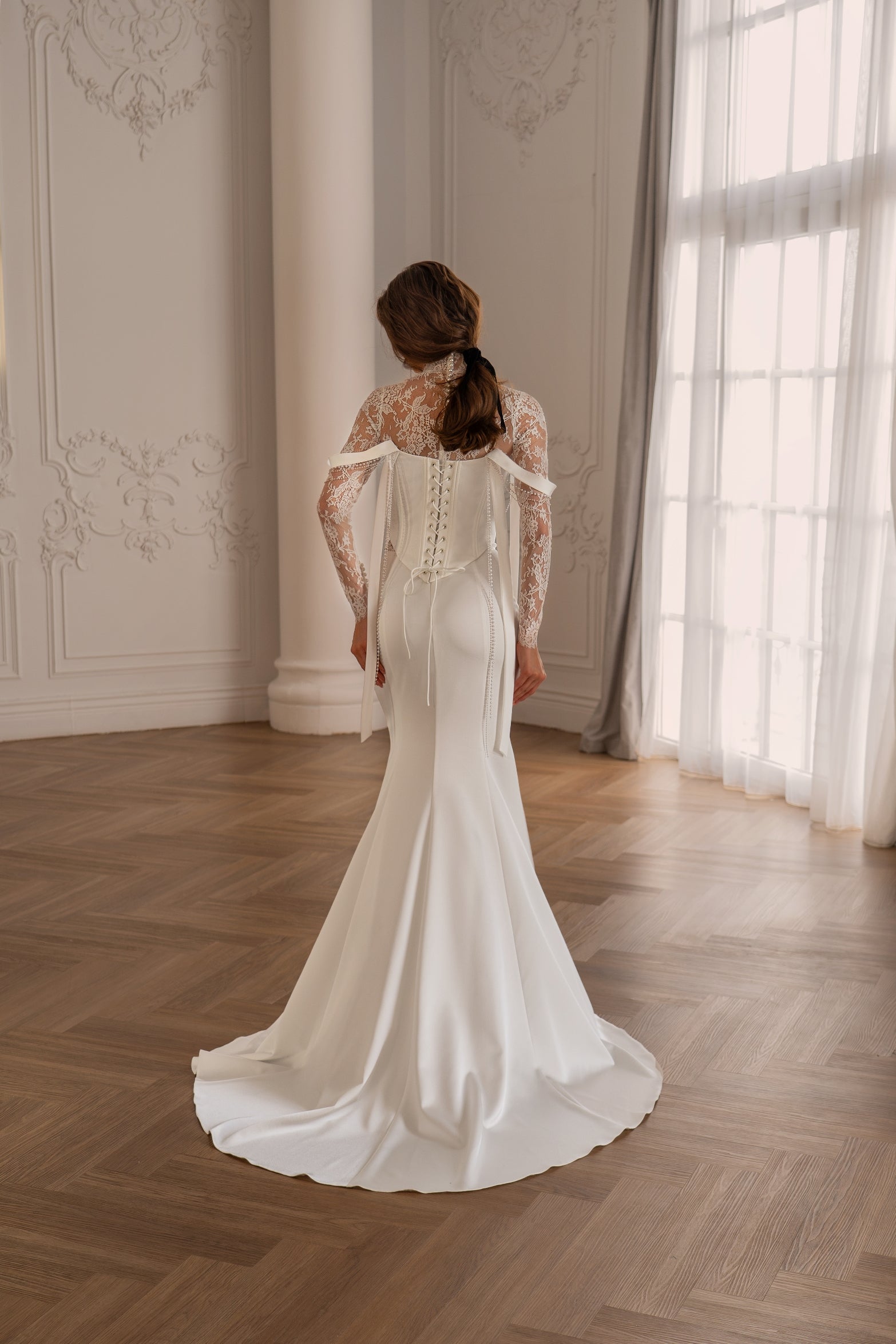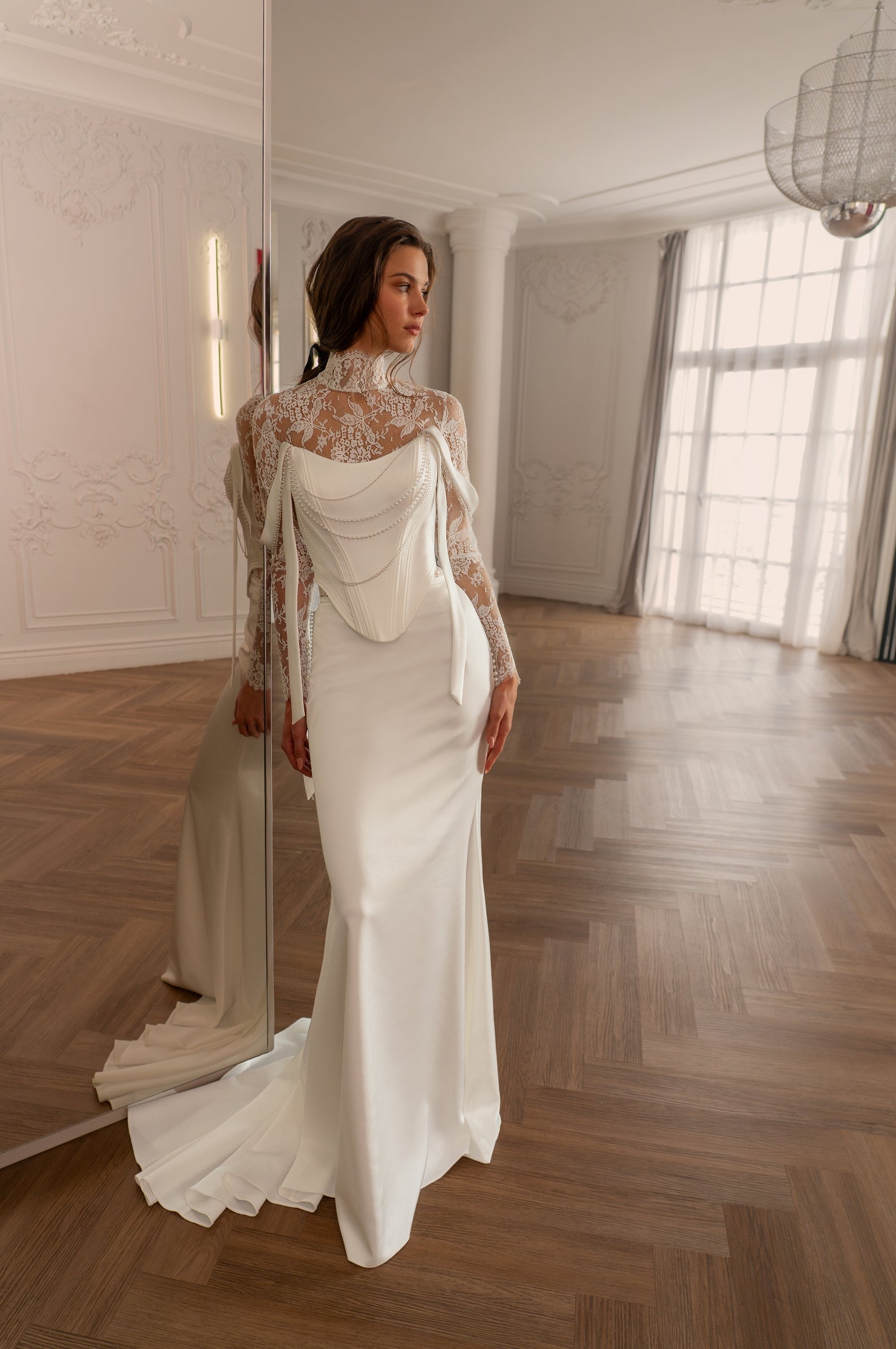 Presenta un corsé de satén esculpido superpuesto a un delicado corpiño de encaje, lo que permite a la novia pasar sin problemas de un estilo de ceremonia modesto y romántico a una silueta de noche elegante y moderna.