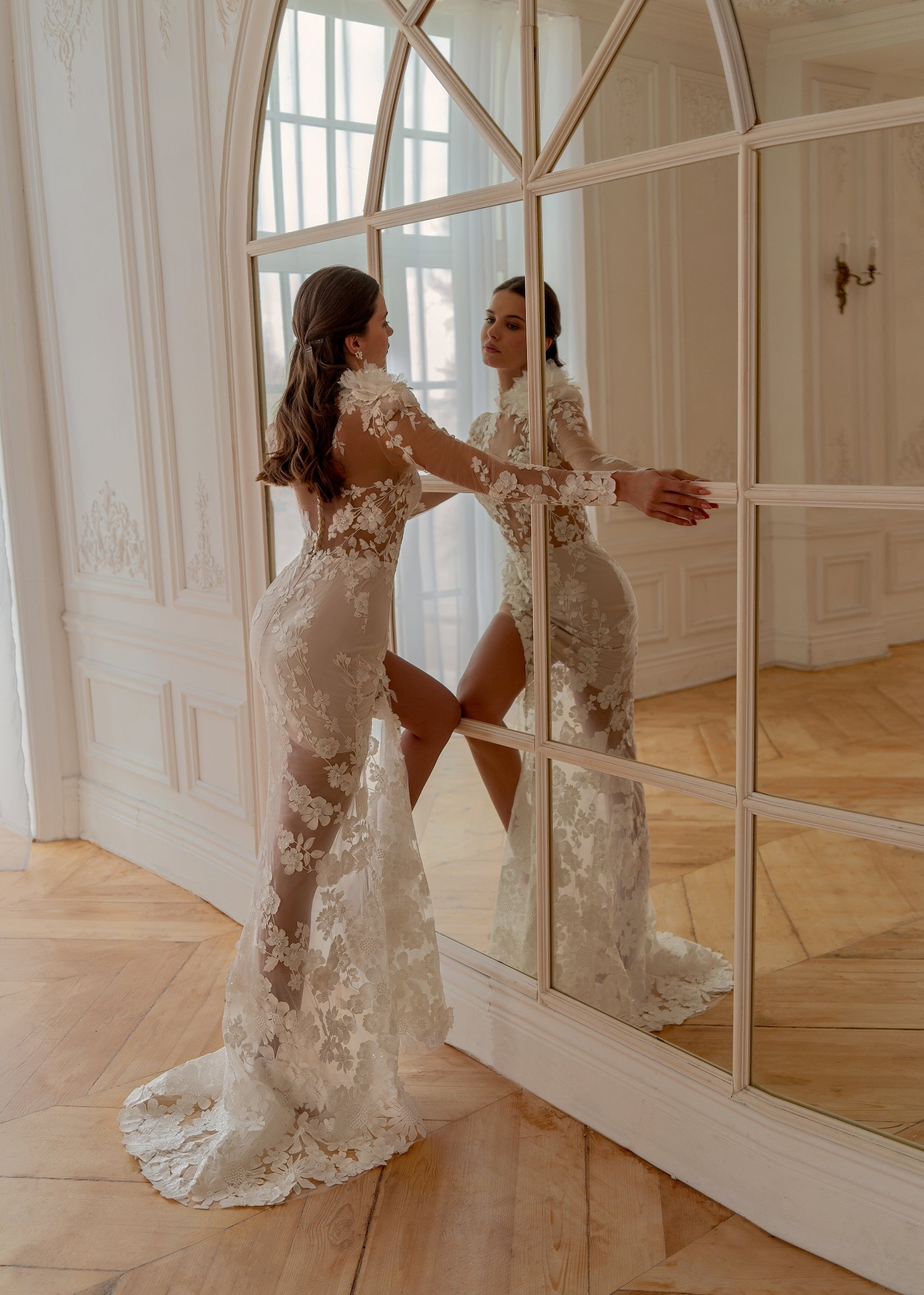 Vestido de novia de encaje transparente con cuello alto y abertura lateral | Silueta floral moderna