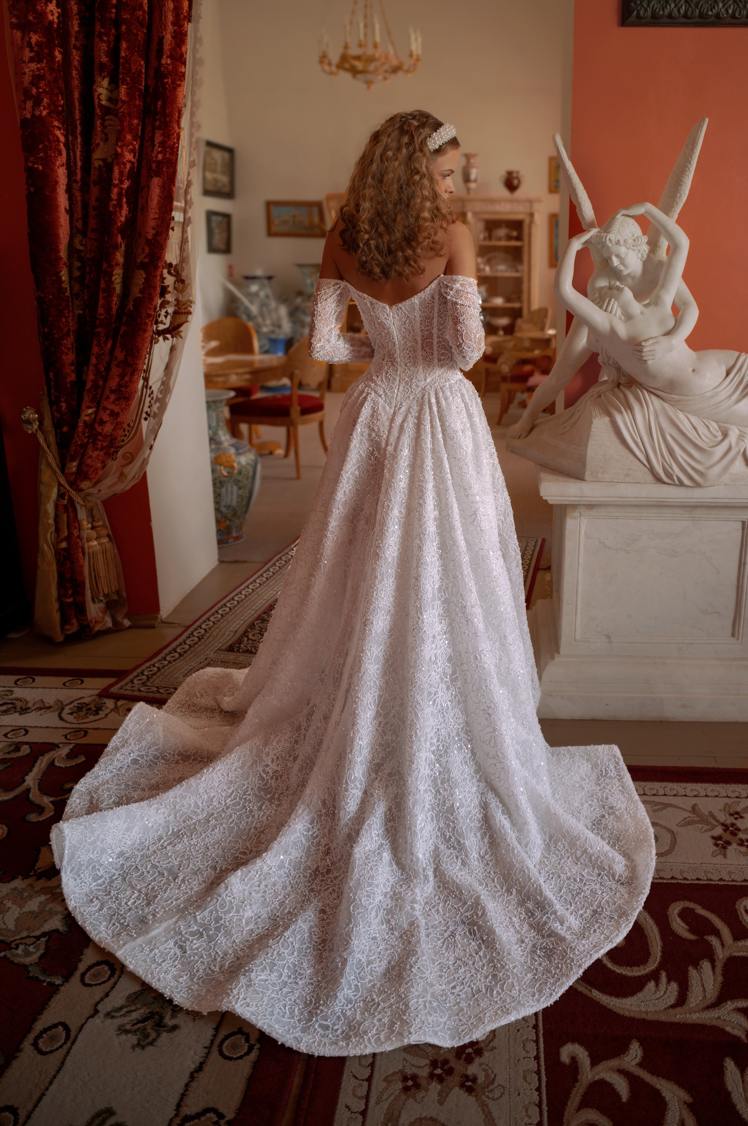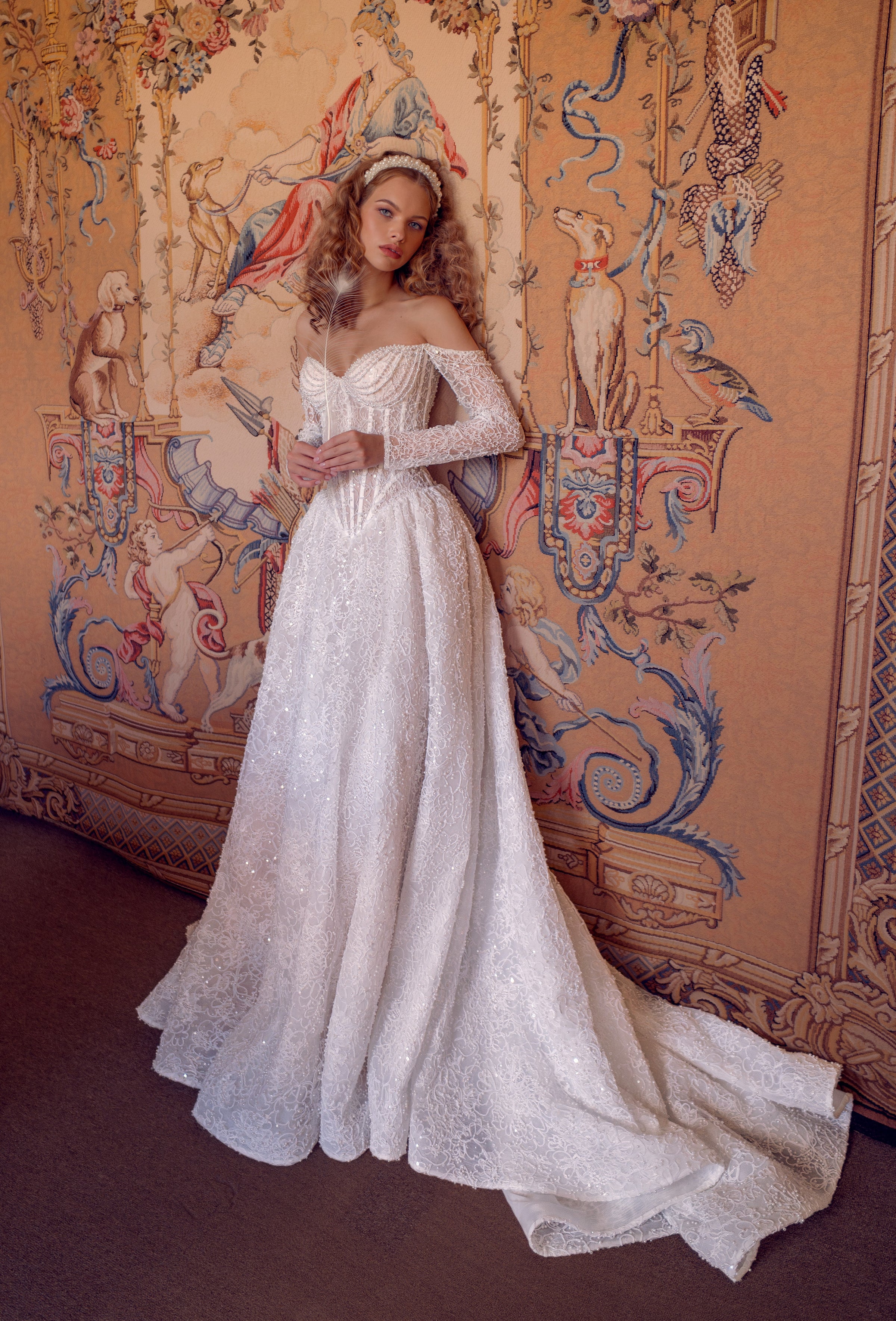 The off-shoulder corset bodice, draped in delicate pearls and sequins, sculpts the figure with effortless elegance.