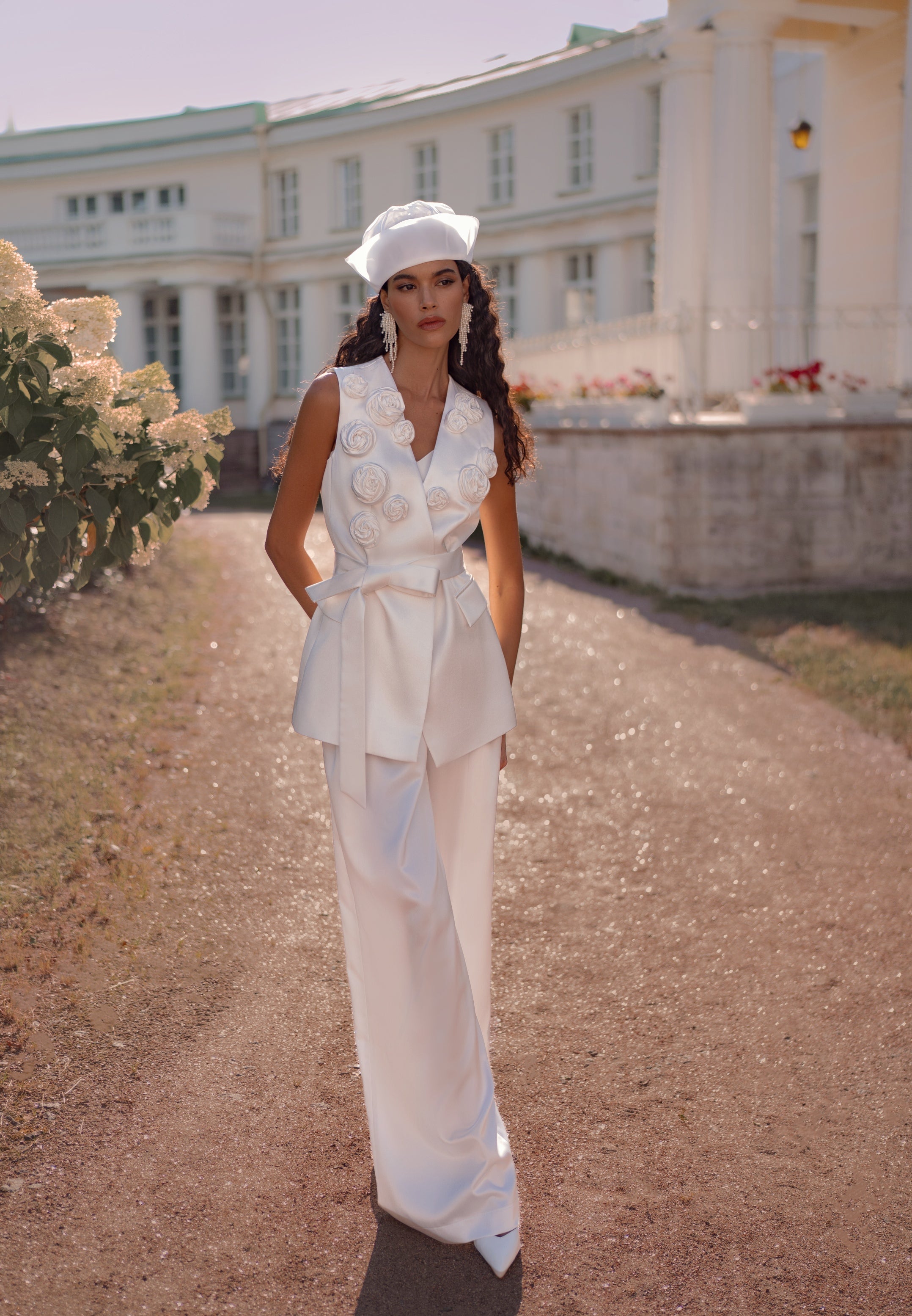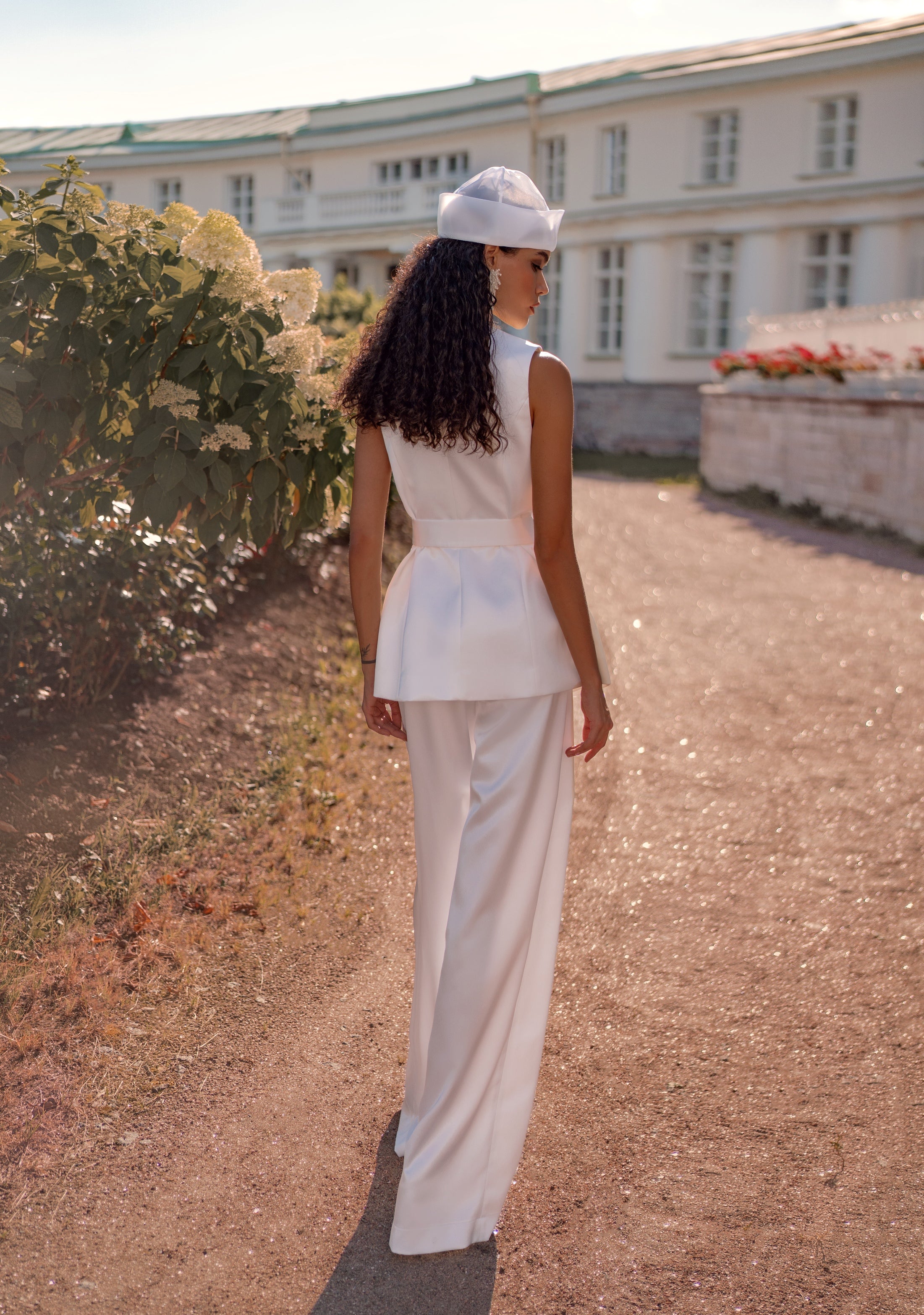 bridal pantsuit, modern wedding suit, crepe bridal jacket and trousers, minimalist wedding outfit, contemporary bridal look, sleeveless bridal blazer, elegant civil wedding outfit, romantic modern bride, ensemble de mariage moderne, traje de novia moderno, completo da sposa contemporaneo, modern gelinlik takımı, pantolonlu gelinlik, فستان زفاف ببدلة عصرية, モダンブライダルスーツ, 当代花嫁裤装