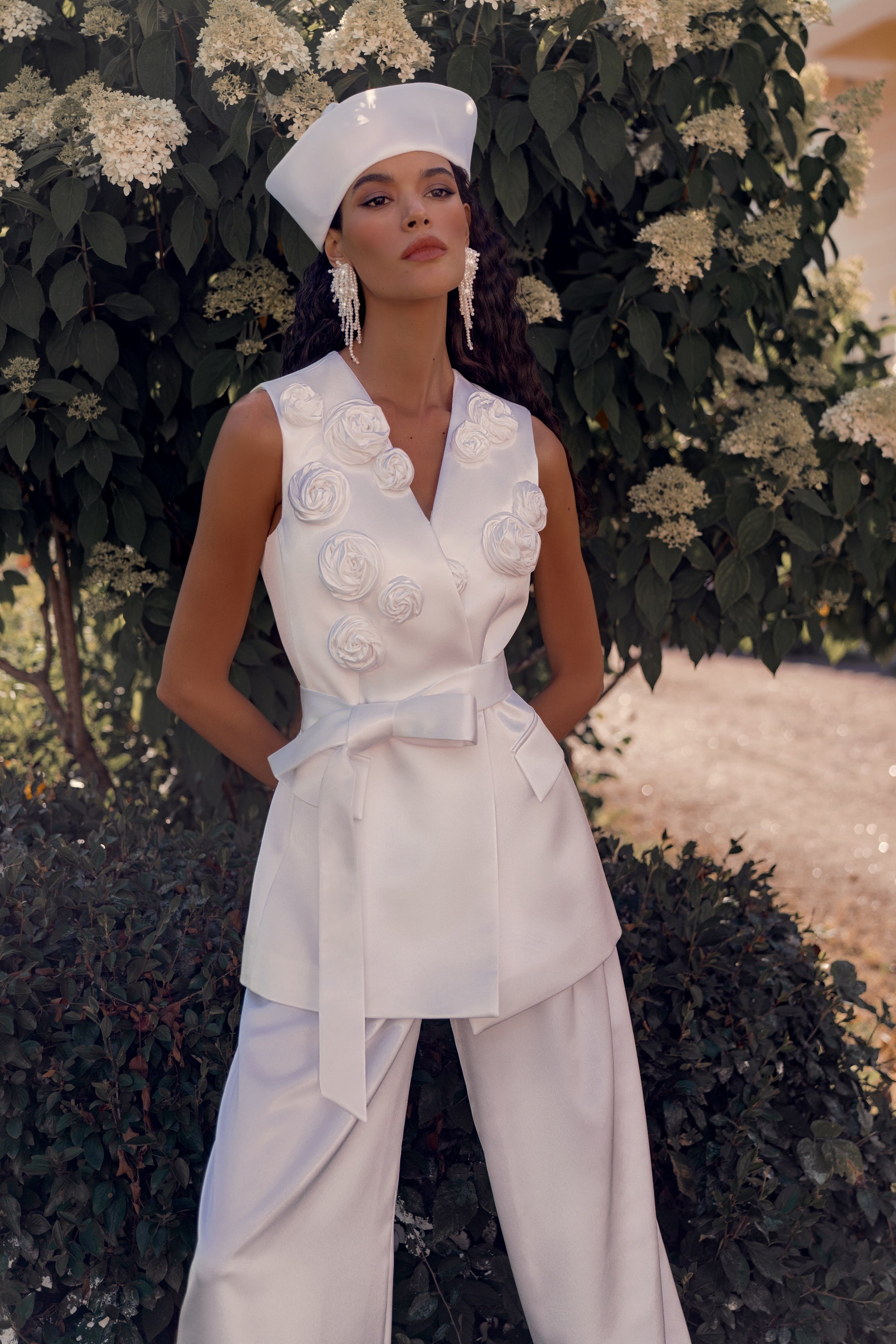 The sleeveless tailored jacket features sculpted floral appliqués and a cinched waist with a structured bow belt, paired with fluid wide-leg crepe trousers that move effortlessly with every step.