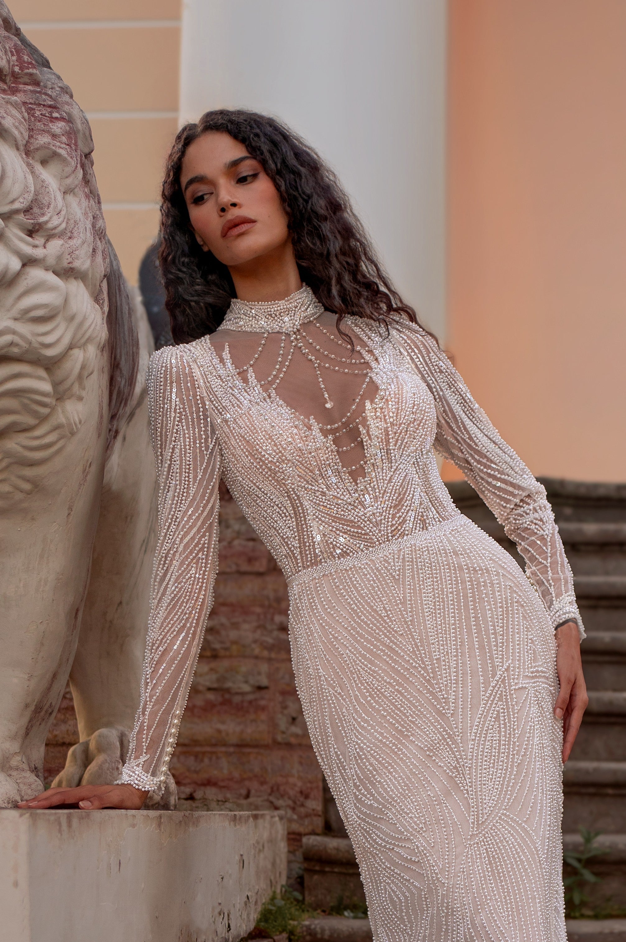 beaded long sleeve wedding dress, illusion high neck bridal gown, pearl beaded lace gown, fitted mermaid wedding dress, sparkling evening bridal look, beaded tulle wedding gown, high-neck sheer bodice dress, elegant modern bride, robe de mariée perlée manches longues, vestido de novia con perlas, abito da sposa con perline, boncuk işlemeli uzun kollu gelinlik, yüksek yakalı gelinlik, فستان زفاف مرصع بالخرز والأكمام الطويلة, ビーズ付きウェディングドレス, 珠绣长袖婚纱