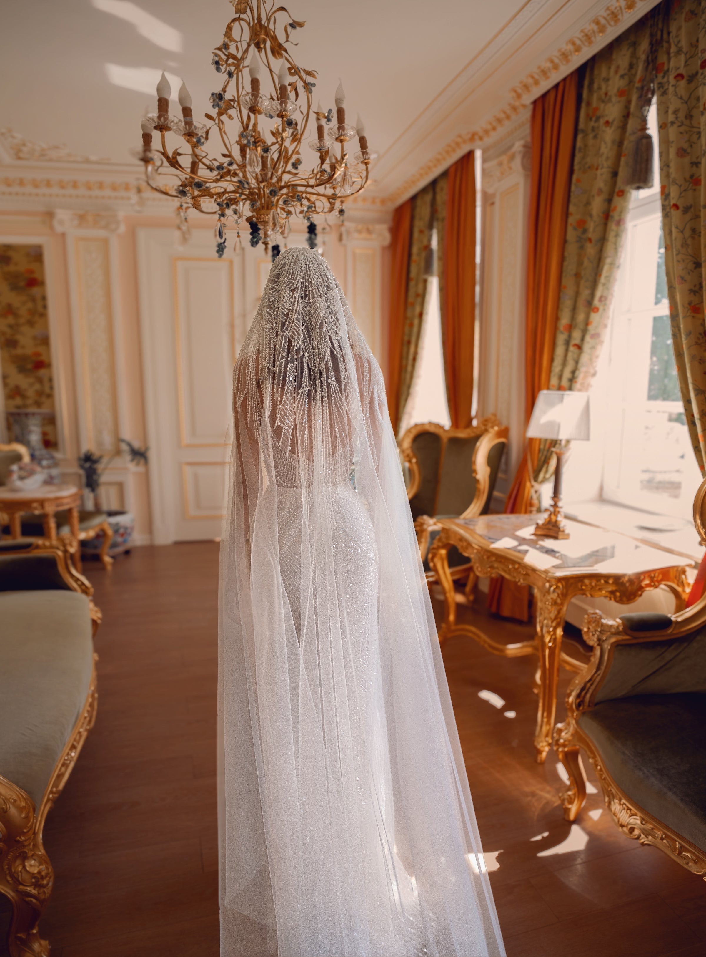 Enhance the gown’s brilliance with delicate crystal earrings or a sleek low bun to highlight the radiant neckline and veil.