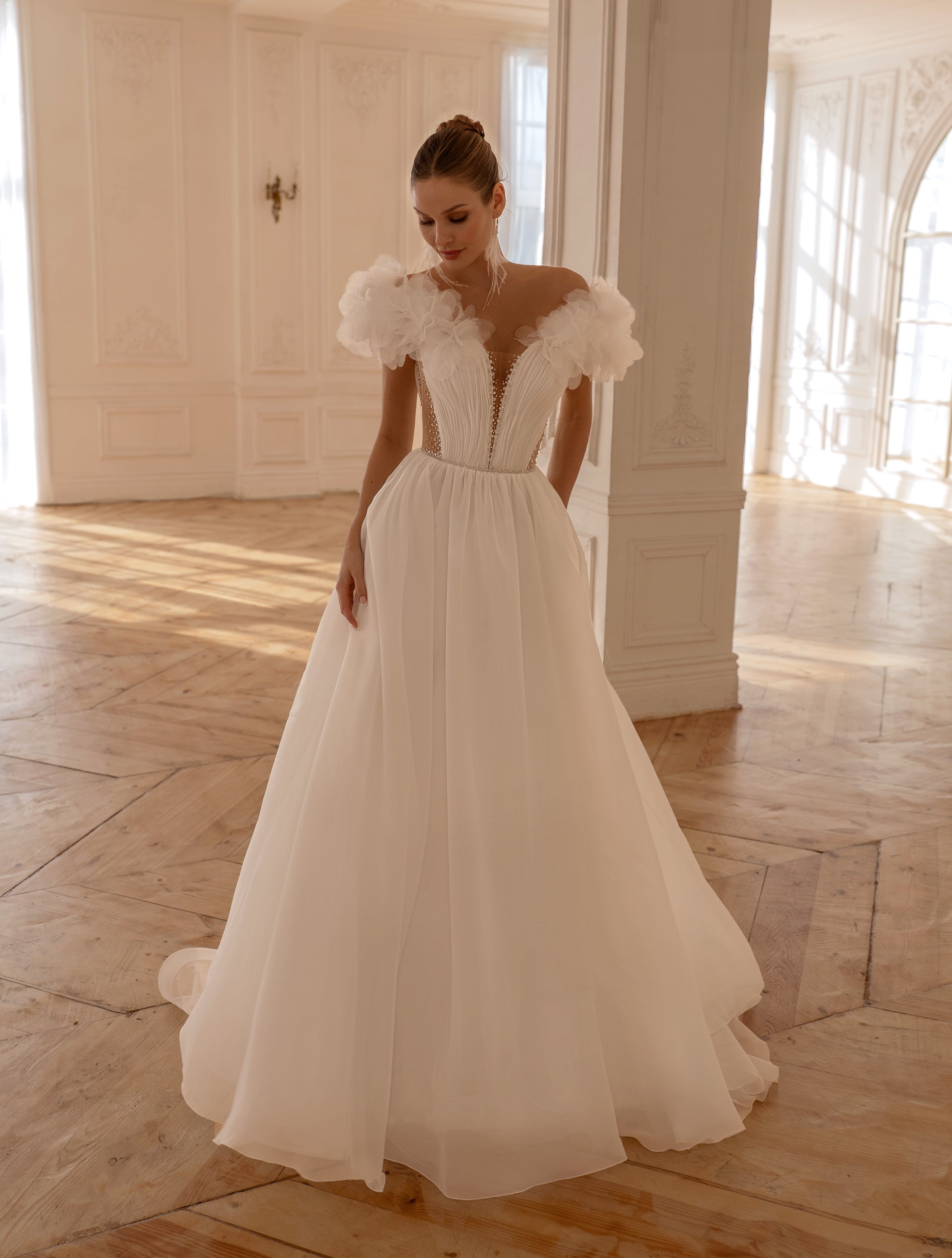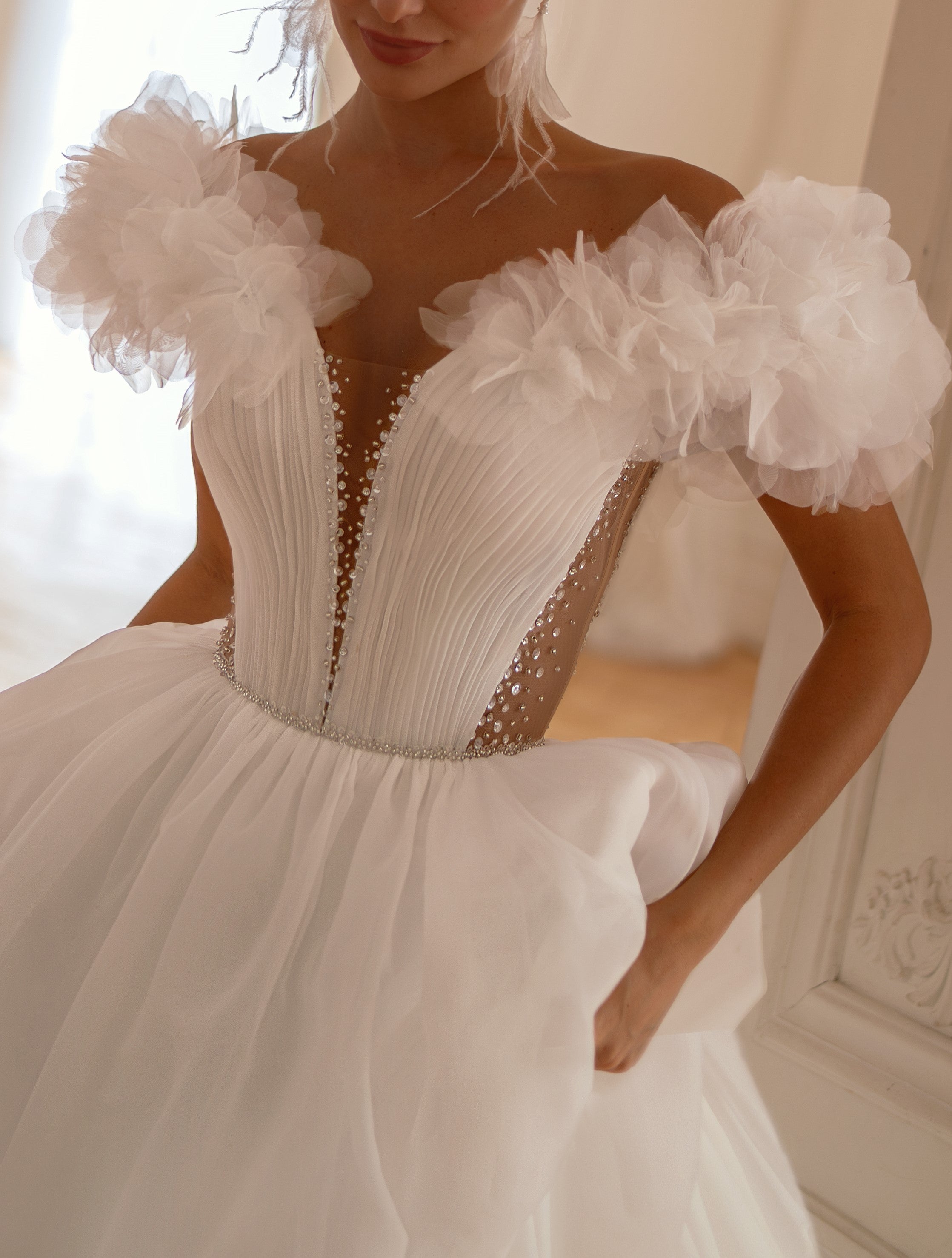organza floral wedding dress, off-shoulder puff sleeve bridal gown, romantic fairytale wedding dress, soft organza ball gown, illusion corset bridal gown, voluminous flower sleeve wedding dress, elegant romantic bride dress, couture organza gown, ethereal bridal fashion, romantic cloud-like wedding dress, robe de mariée organza fleurs, vestido de novia organza flores, abito da sposa organza fiori, organze çiçekli gelinlik, romantik gelinlik, فستان زفاف من الأورجانزا والزهور, オーガンザの花嫁ドレス, 蕾丝花朵欧根纱婚纱