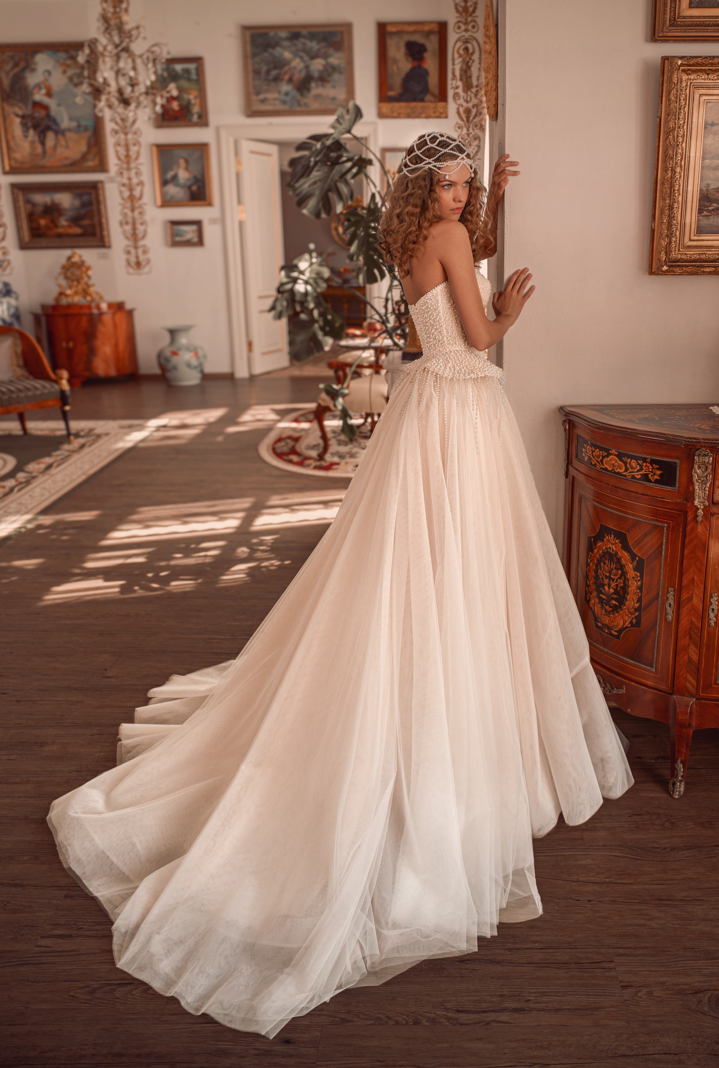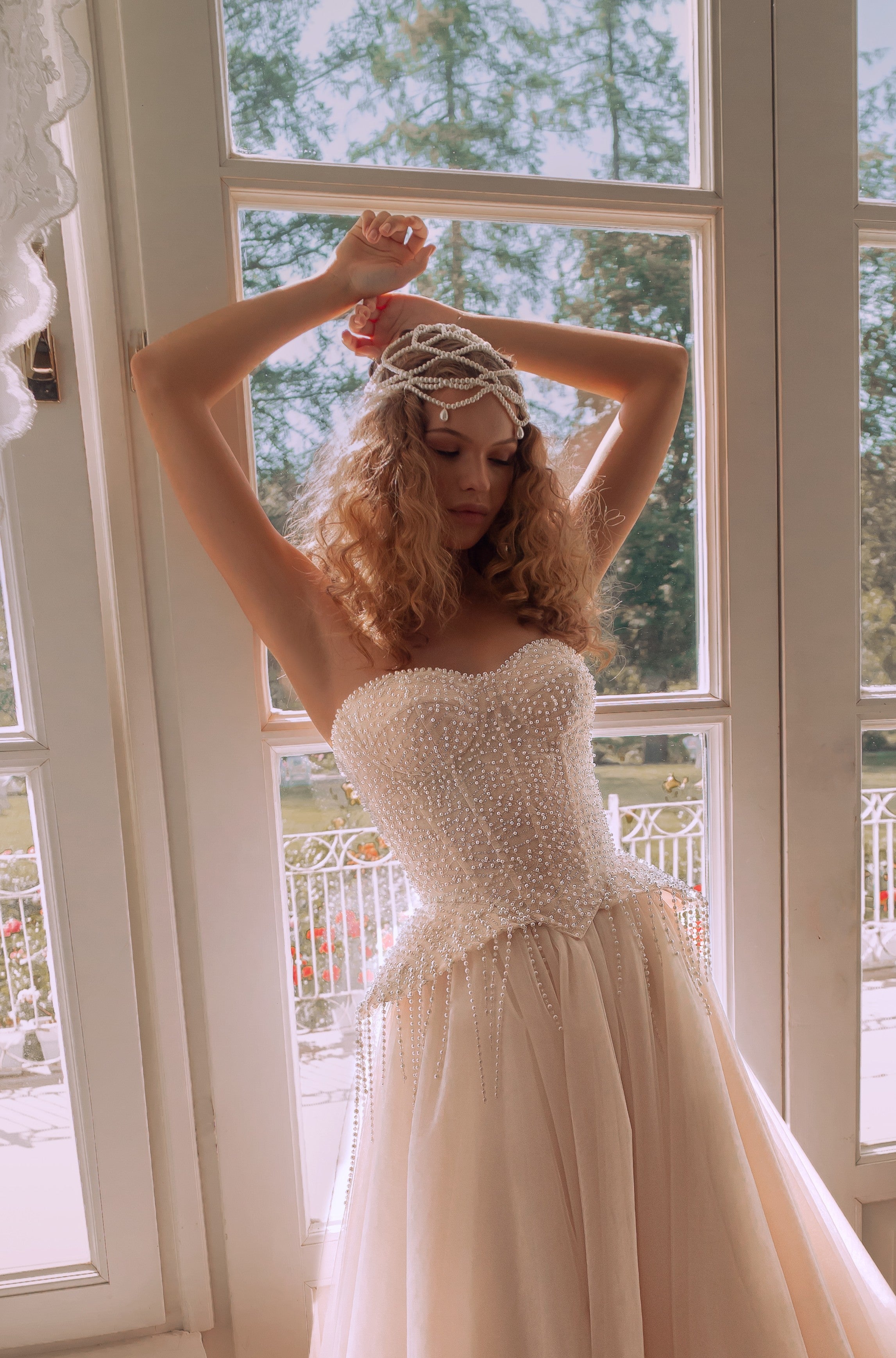 The corset enhances the waistline while the tulle layers create a soft, dreamy volume. Each pearl is thoughtfully applied, transforming this gown into a luminous statement of love and refinement.