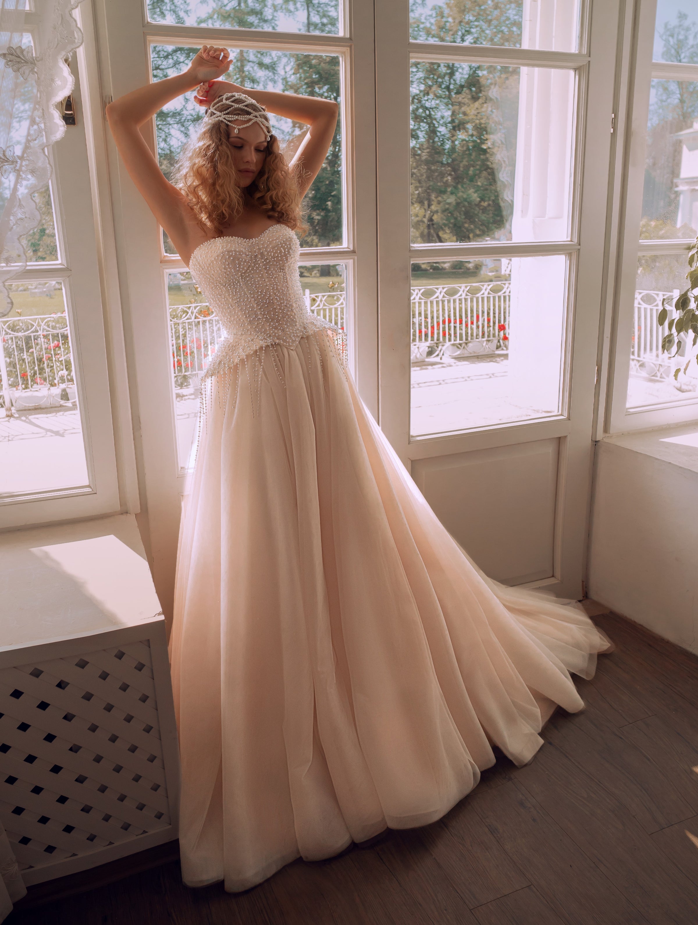A vision of timeless elegance and contemporary artistry, this strapless pearl-adorned wedding gown radiates sophistication with a whisper of fairytale romance.