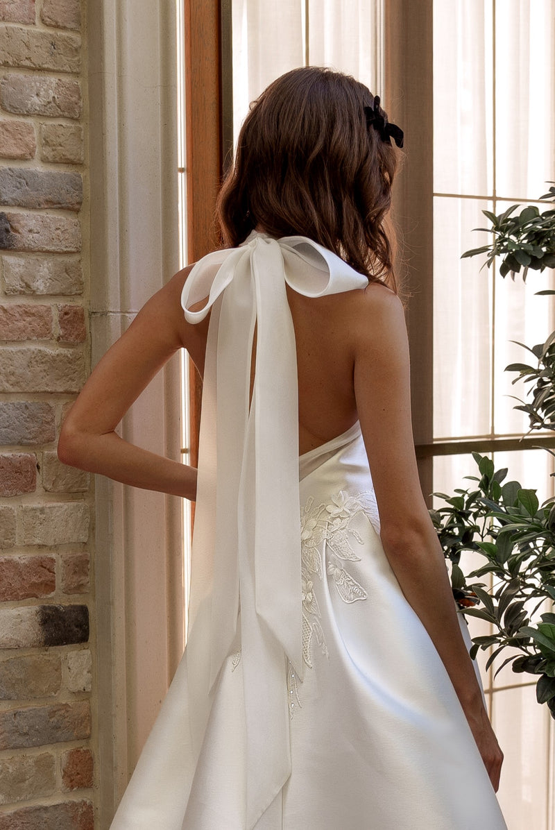 A-Line High Collar Wedding Dress with Slit and Back Neck Bow