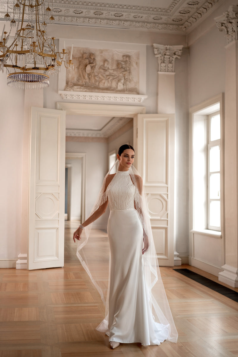 Turn heads in our Mermaid  Wedding Dress, designed for the bold and glamorous bride. This stunning gown features a high halter neckline that elegantly frames your face while showcasing your shoulders. The crafted beadwork hugs your curves, creating a captivating silhouette that flows into a dramatic mermaid shape. With a striking open back that adds an element of allure, this dress is perfect for making a statement on your special day, ensuring you radiate confidence and beauty as you walk down the aisle!