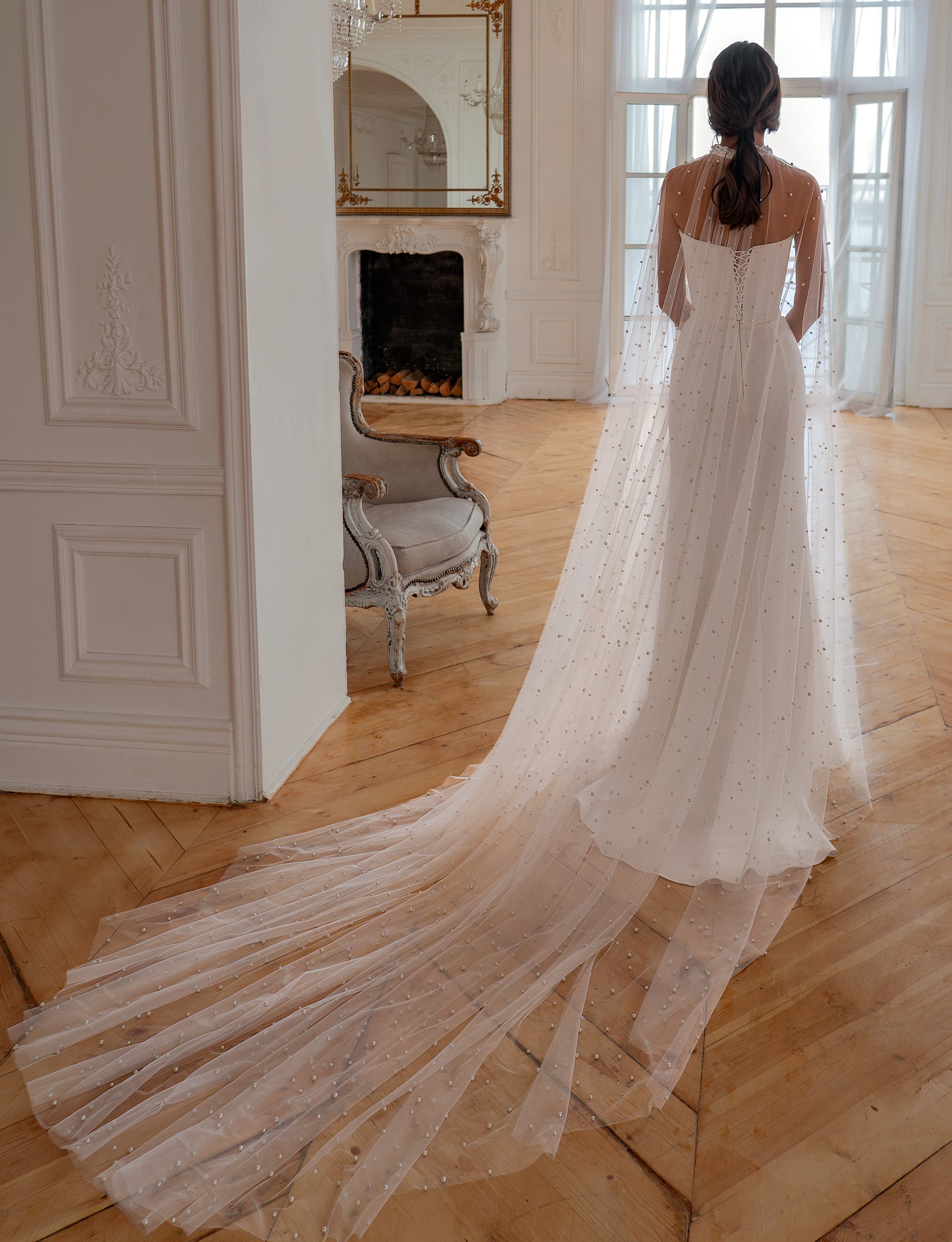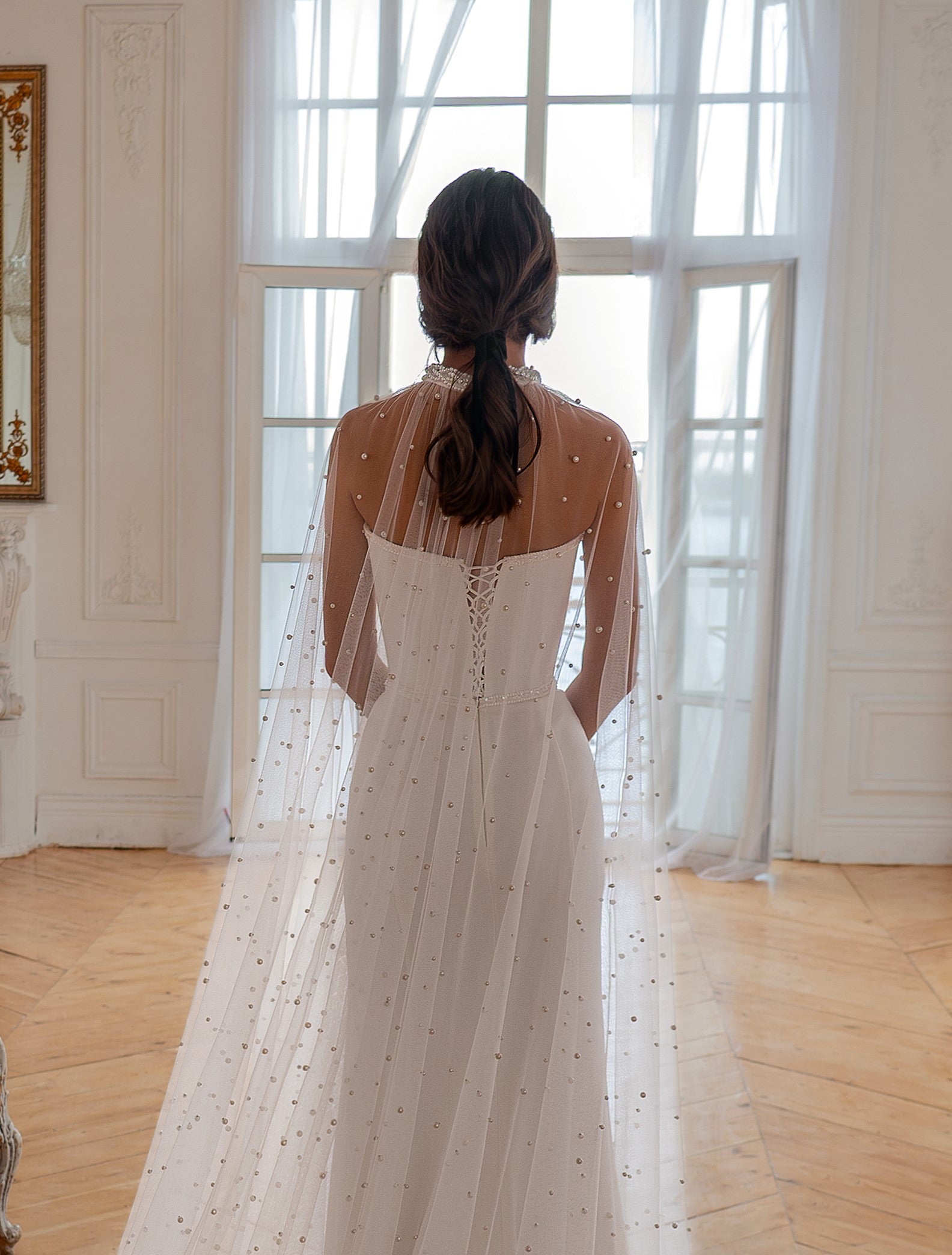 The detachable sheer mesh cape, delicately embroidered with artificial pearls, drapes effortlessly from the shoulders, creating an angelic aura with every movement. A minimal yet striking design, perfect for the bride who seeks timeless elegance with a modern edge.