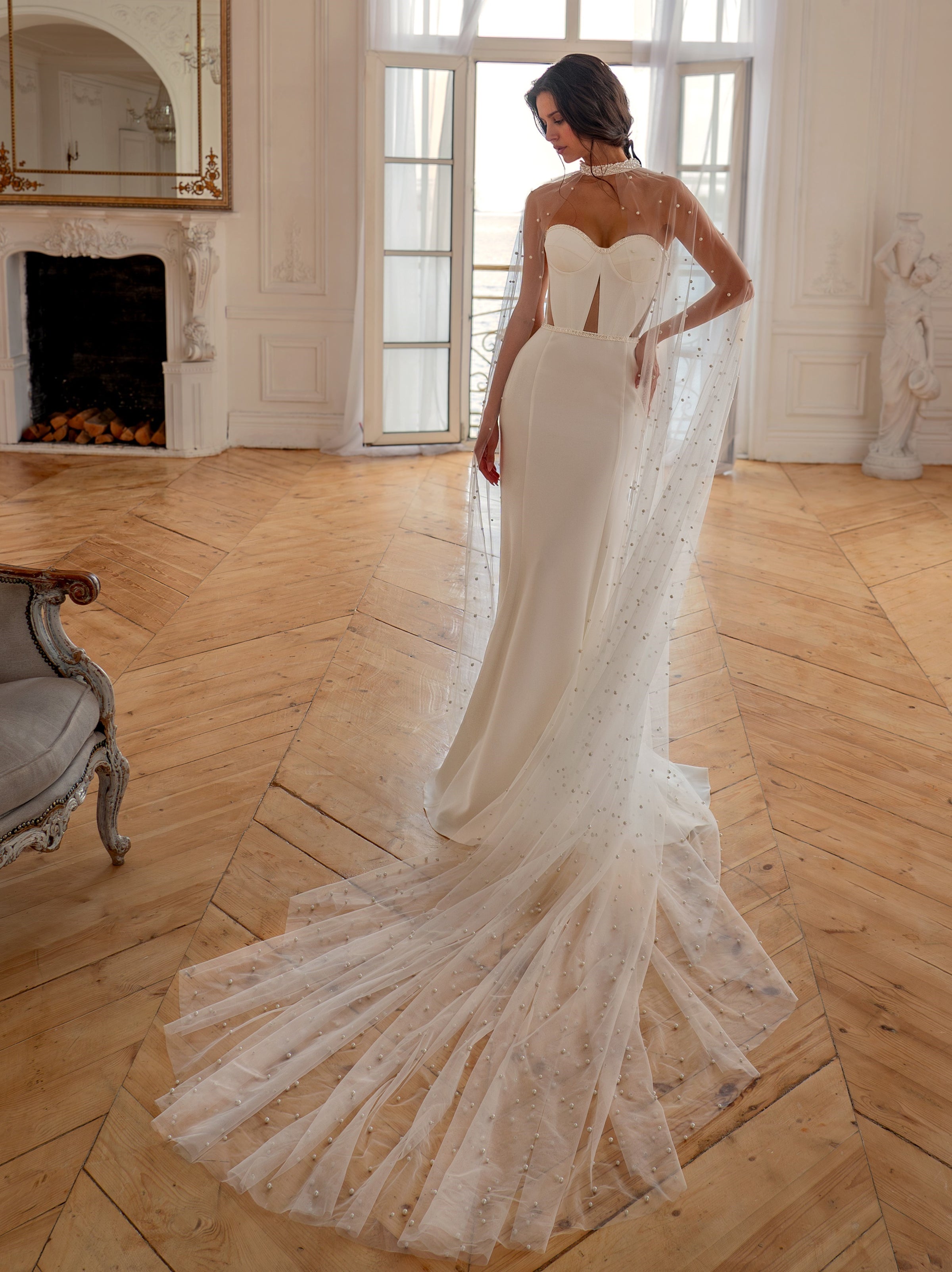 Strapless Crepe Mermaid Wedding Dress with Pearl-Embellished Cape | Modern Grace